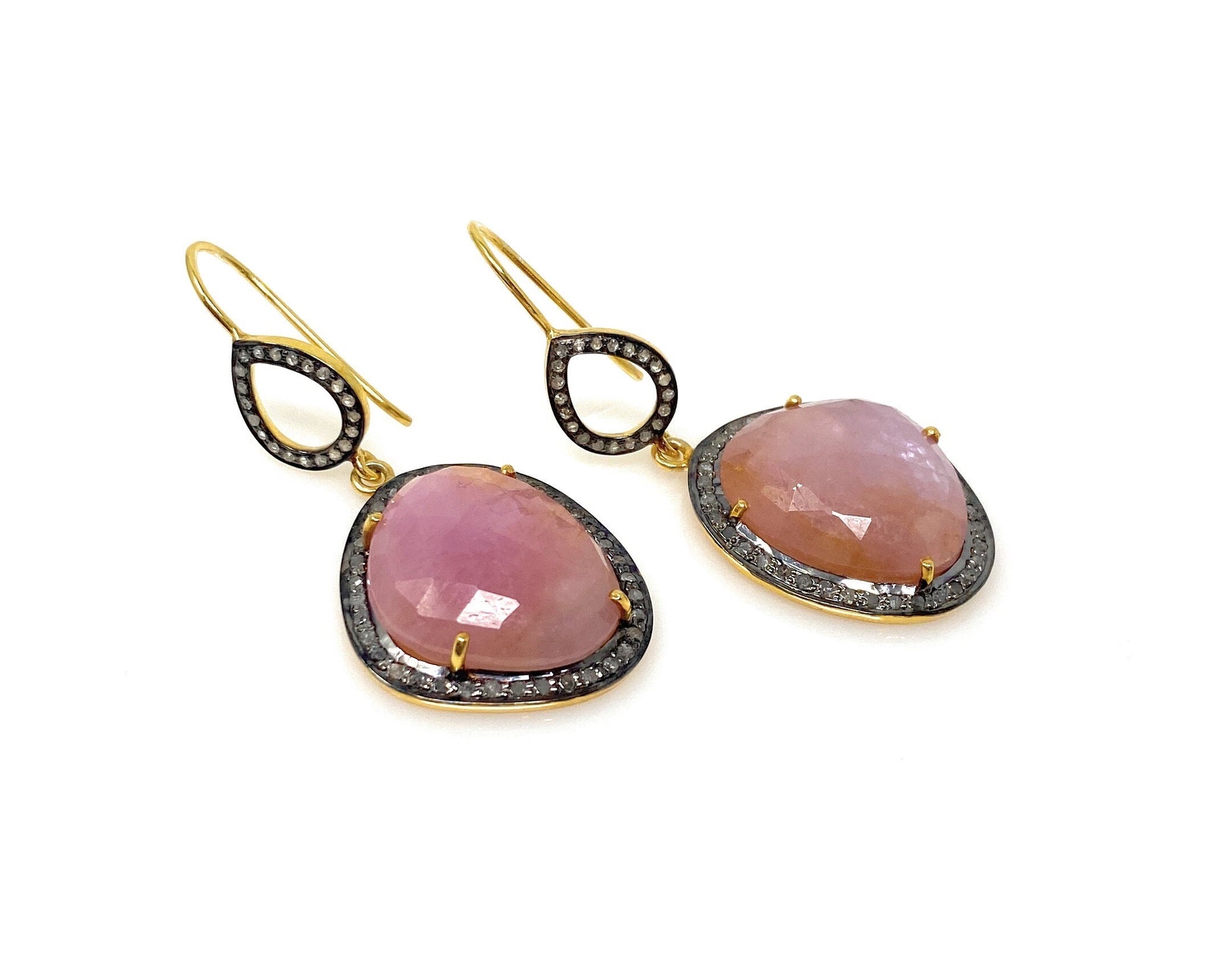 Handmade Genuine Pink Sapphire Pave Diamond Earrings.