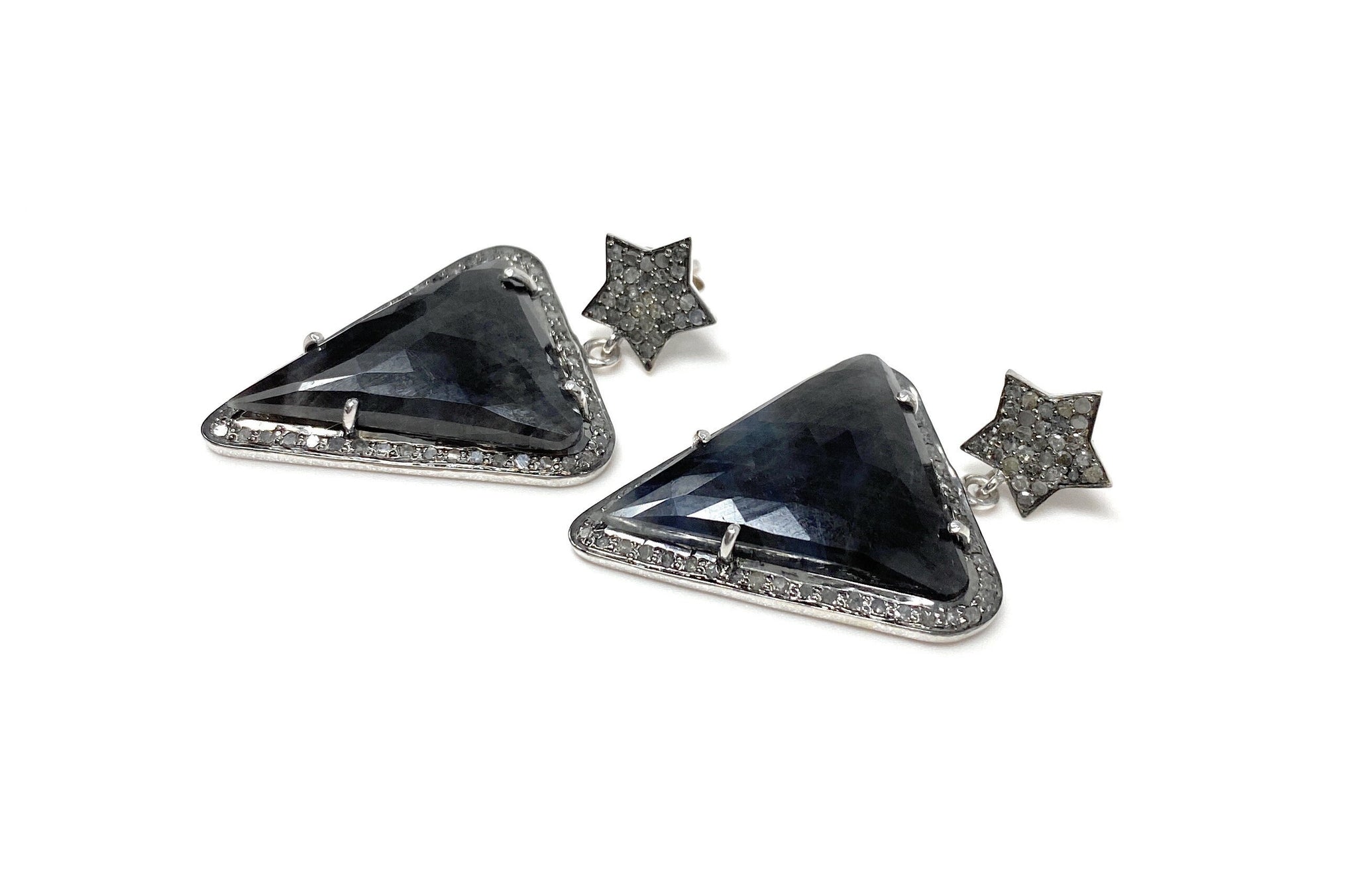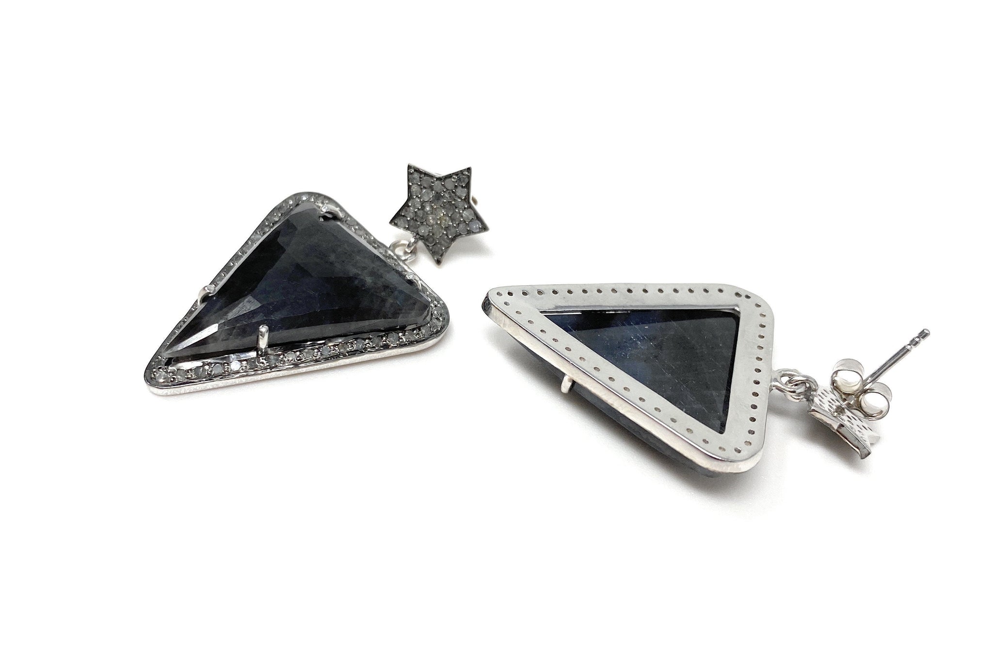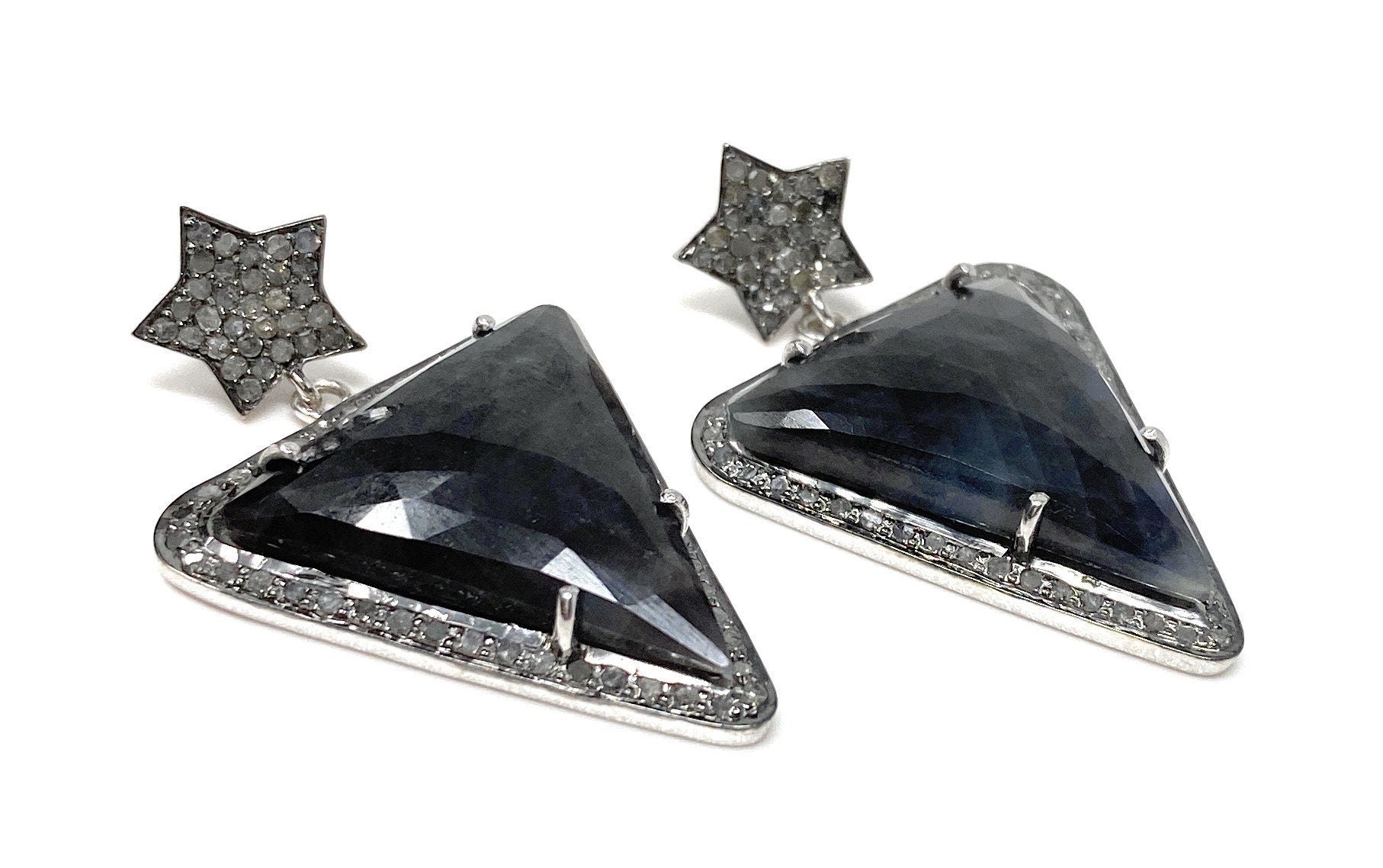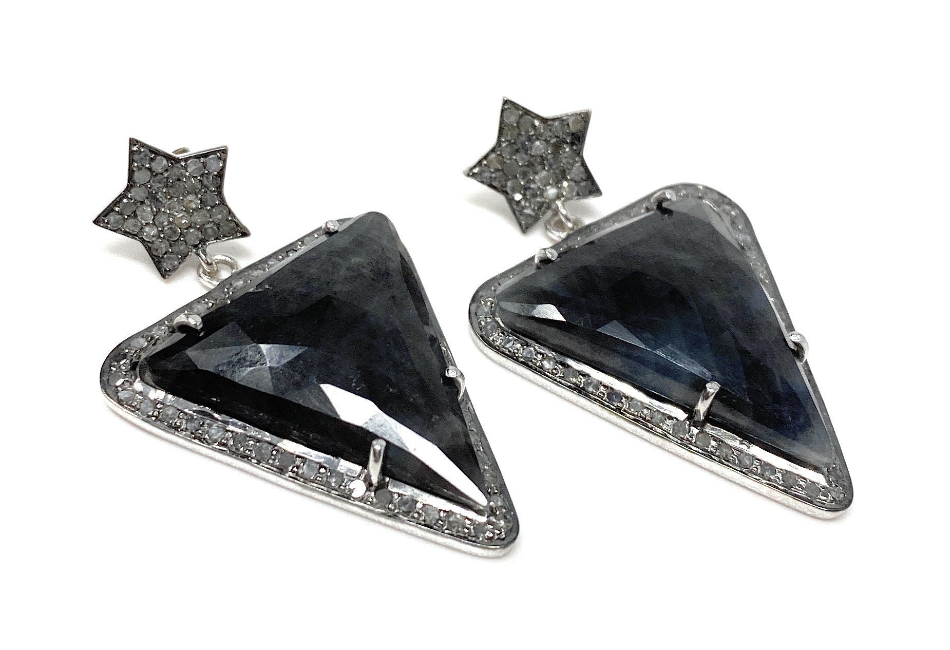 These beautiful Rose Cut Sapphire Earrings are handmade with meticulous care using genuine diamonds and Natural Gemstones bezel set in Black Rhuthenium over Sterling Silver .