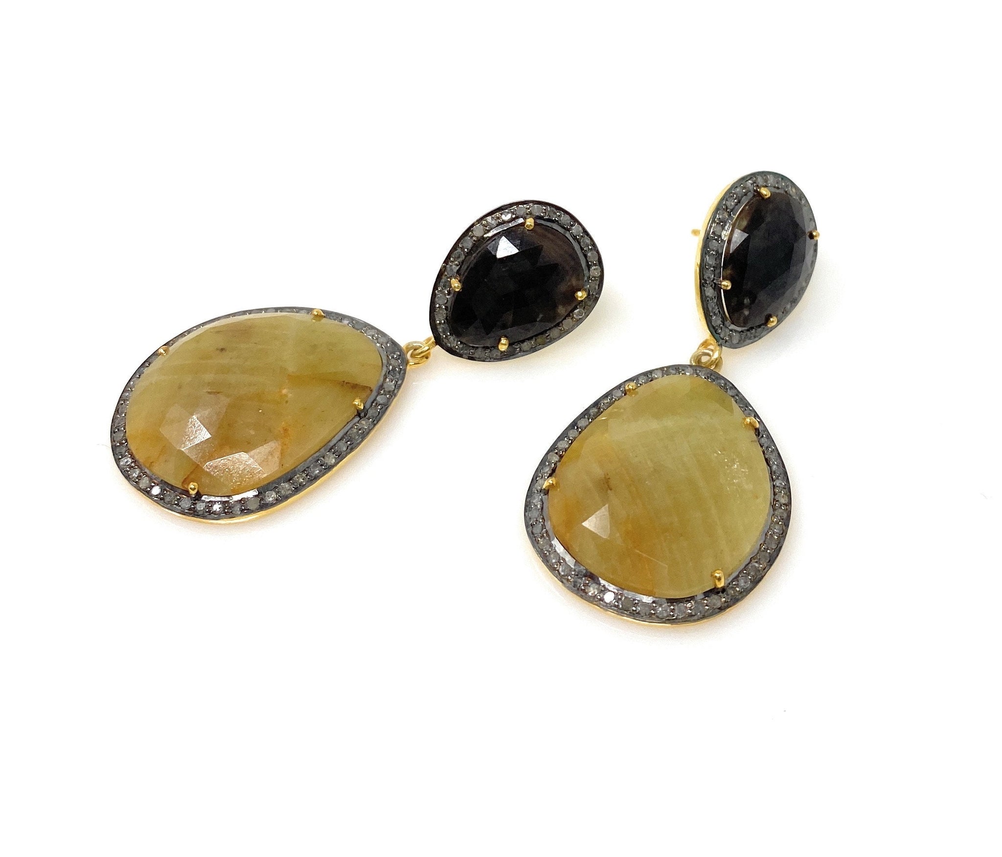 Rare Yellow Sapphire Pave Diamond Earrings, Yellow Sapphire and Smoky Fancy Sapphire Earrings, Genuine Gemstone Earrings