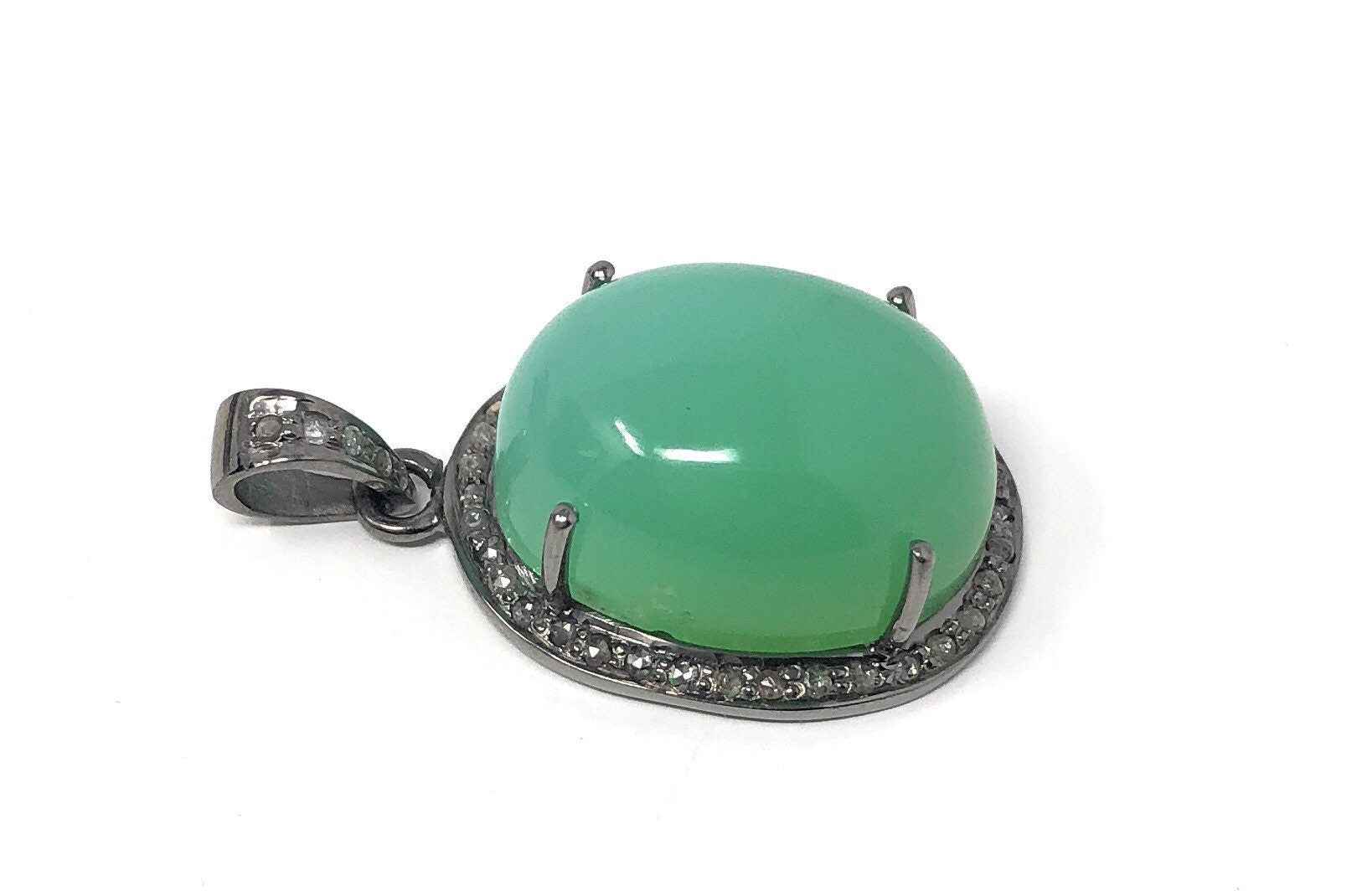 Chrysoprase Pendant, Gemstone Pendant, Silver Pendant, Chrysoprase Diamond Pendant, Pave Diamond Pendant, Sterling Silver Pendant