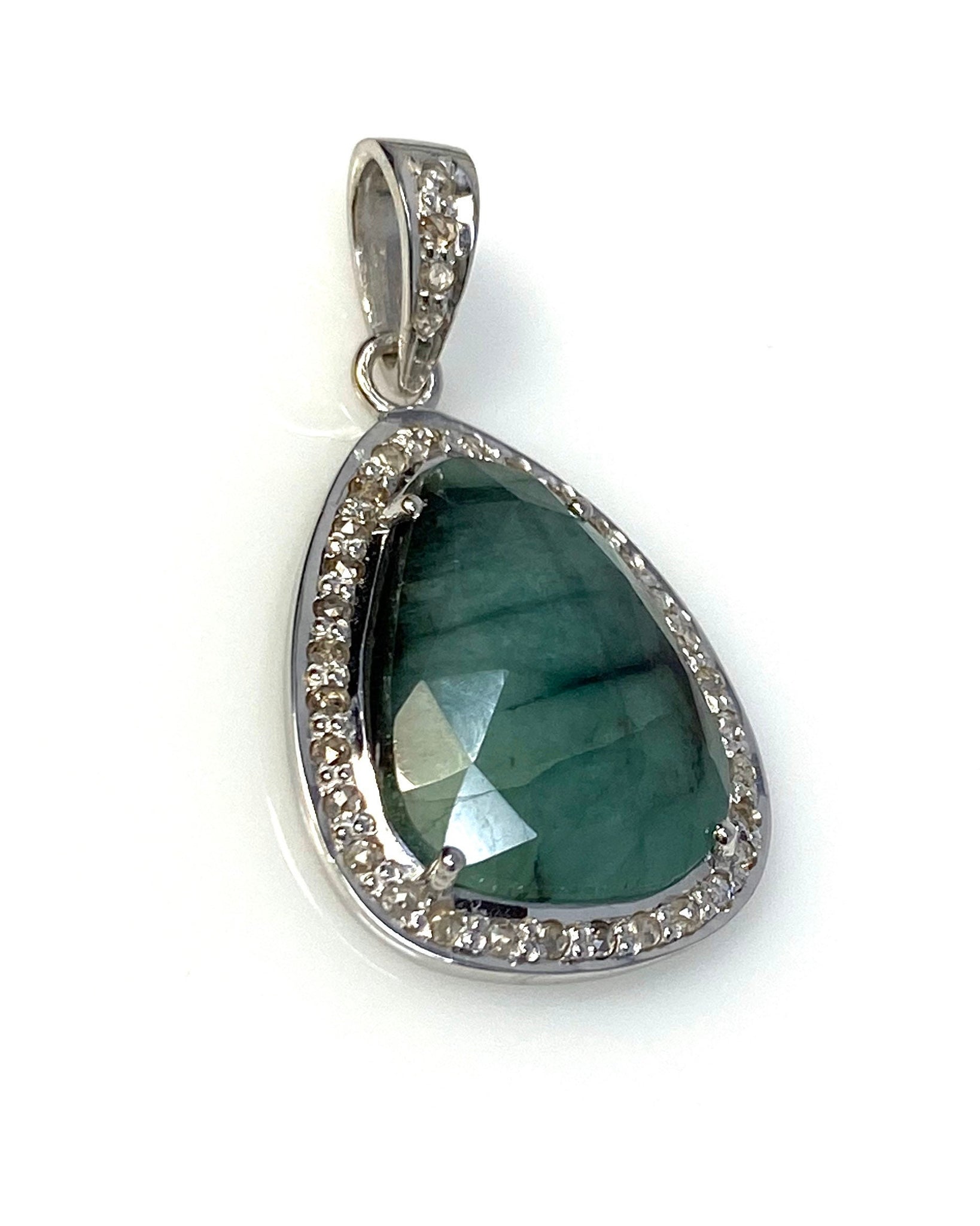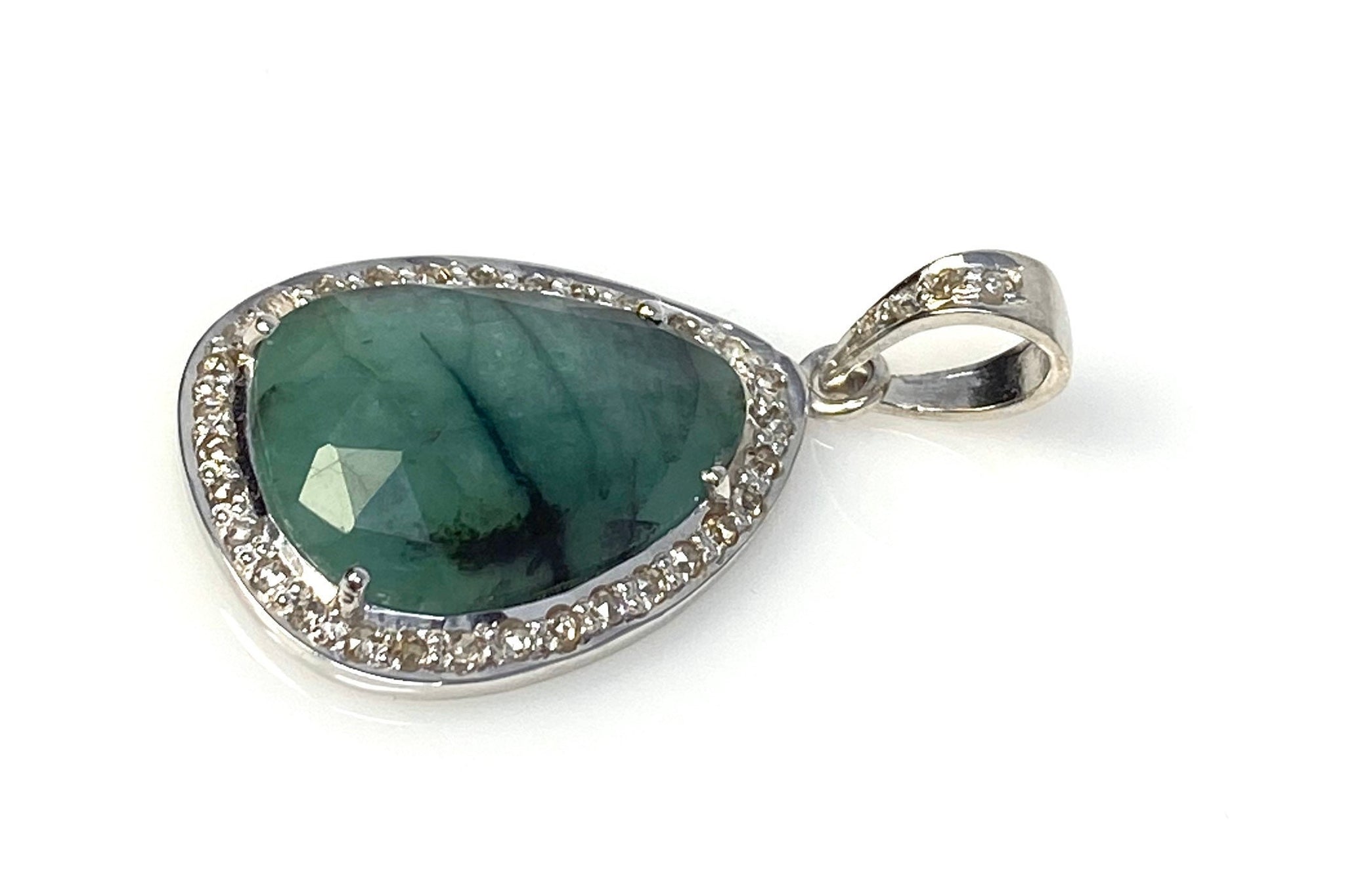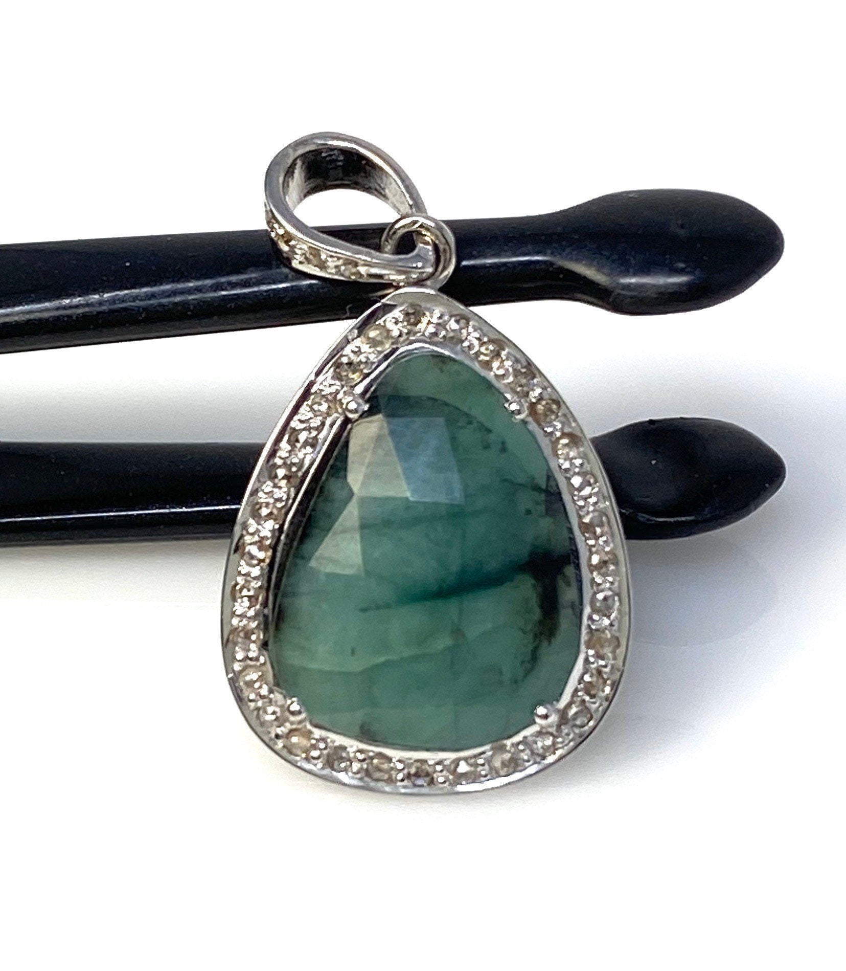 Emerald Diamond Pendant, Natural Emerald Sterling Silver Pendant, May Birthstone Pendant, Pave Diamond Pendant, 1.40” x 0.75”