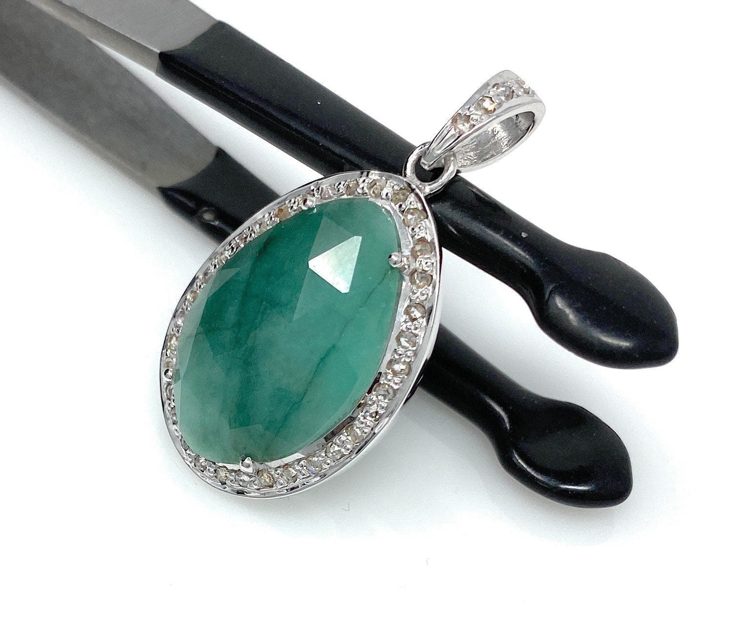 Emerald Diamond Pendant, Natural Emerald Sterling Silver Pendant, May Birthstone Pendant, Pave Diamond Pendant, 1.40” x 0.80”
