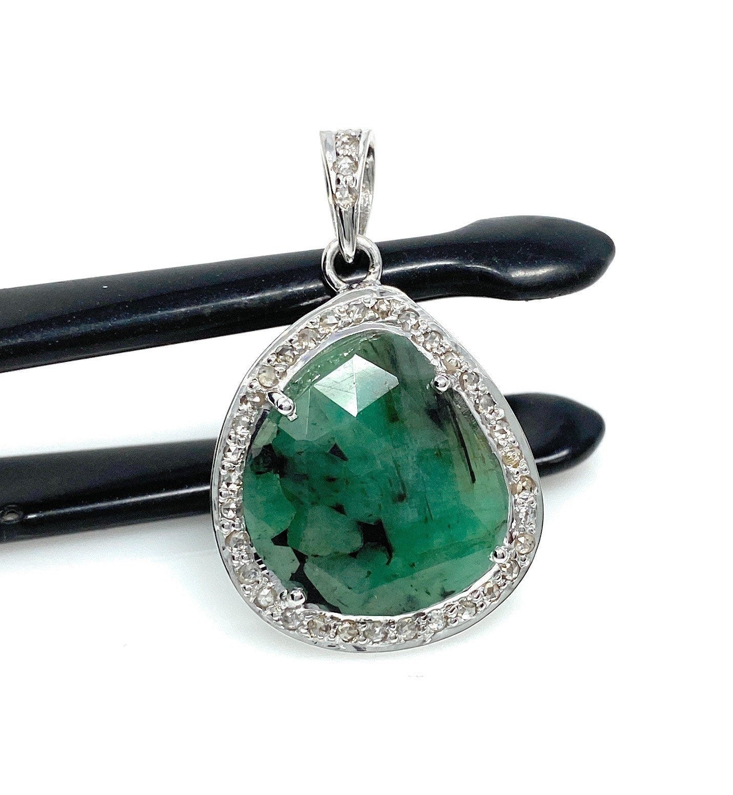 Emerald Diamond Pendant, Sterling Silver May Birthstone Pendant, Spiritual Healing Jewelry, Chakra Balancing Gemstone Pendant, 1.20” x 0.80”