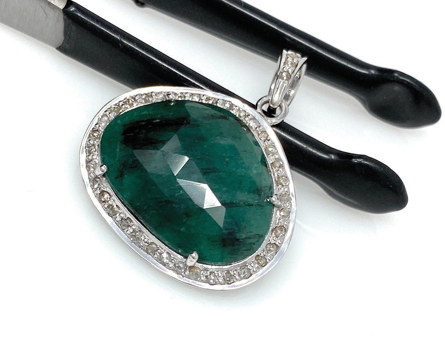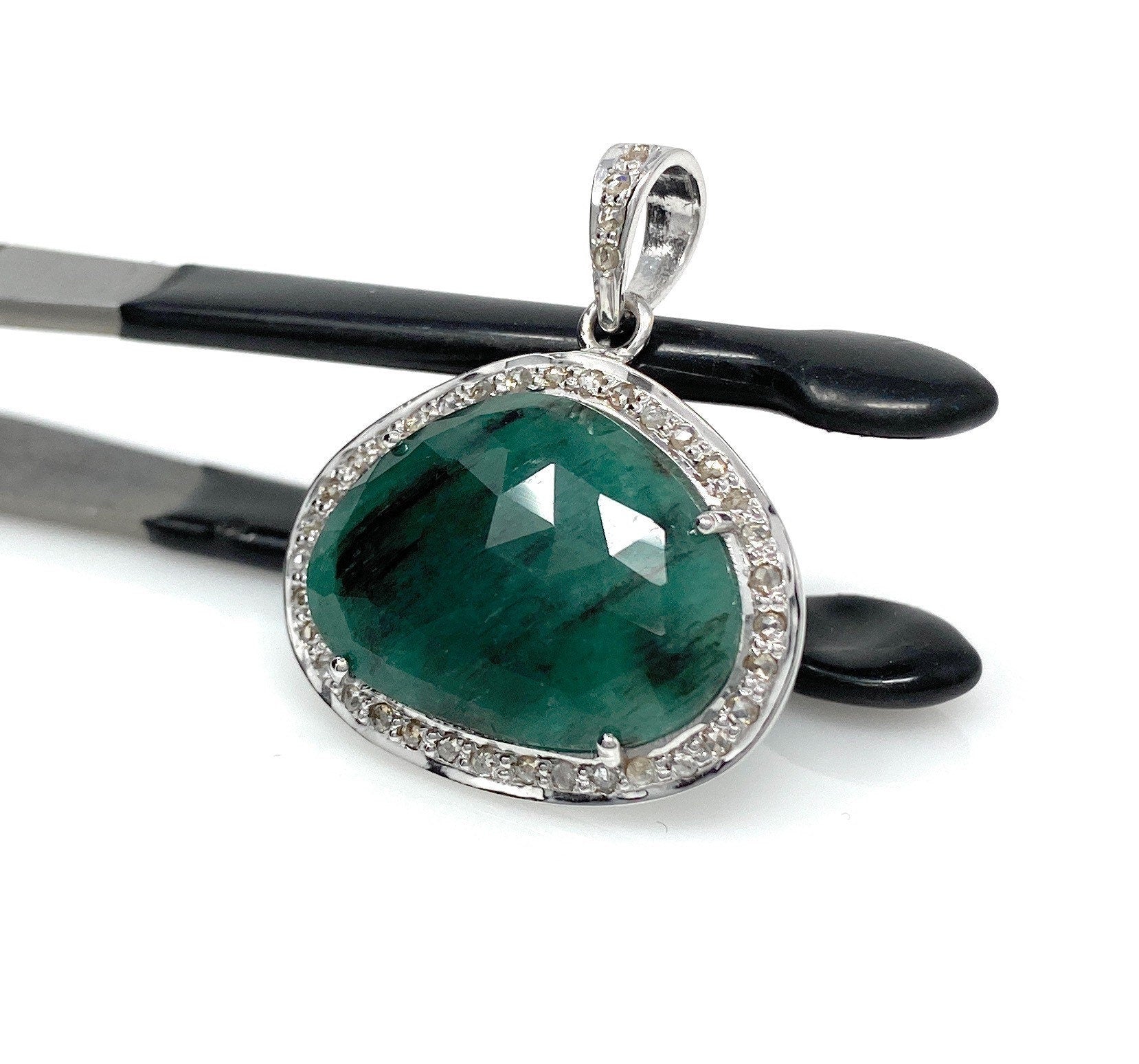 Natural Genuine Rose Cut Sakota Emerald Sterling Silver Diamond Pendant.
