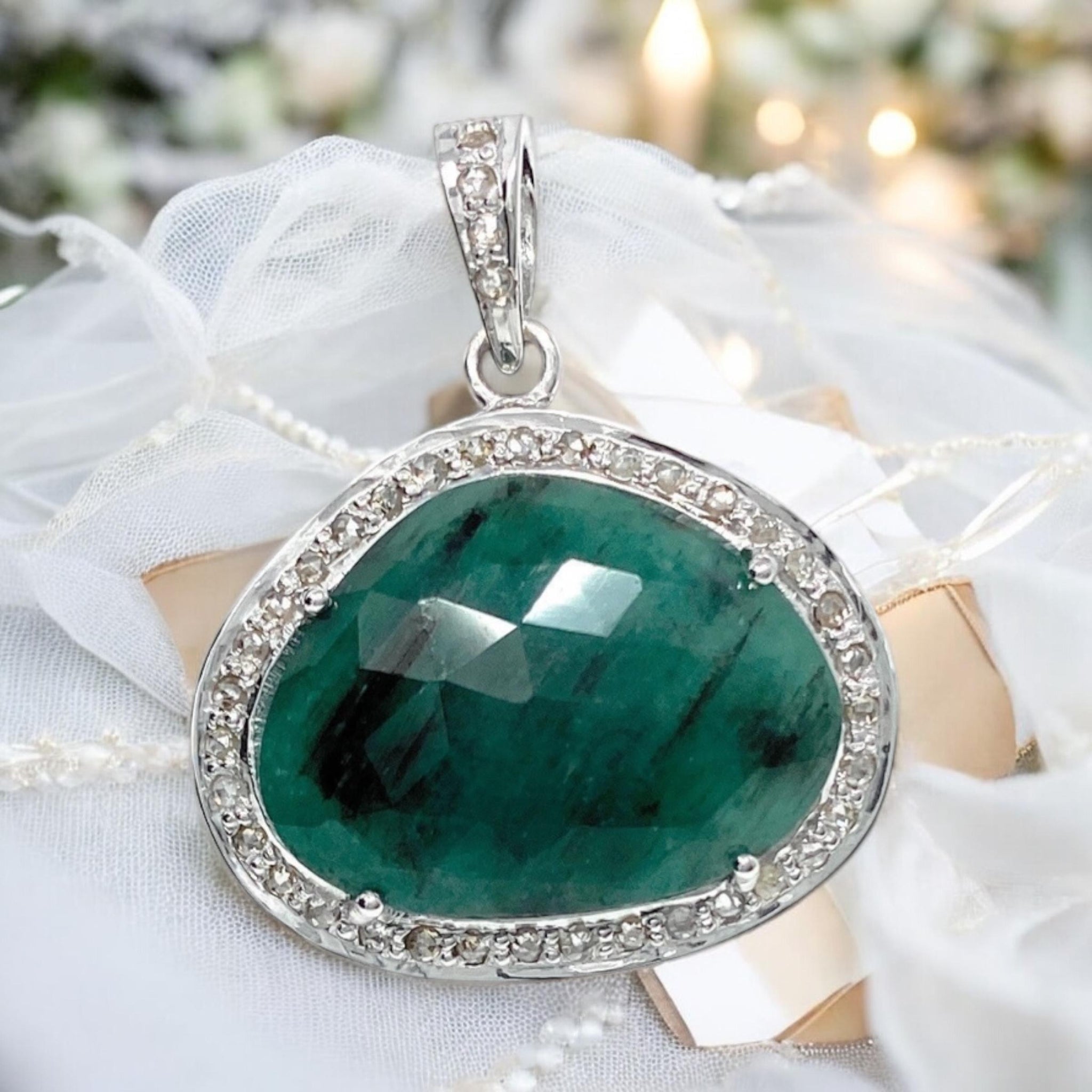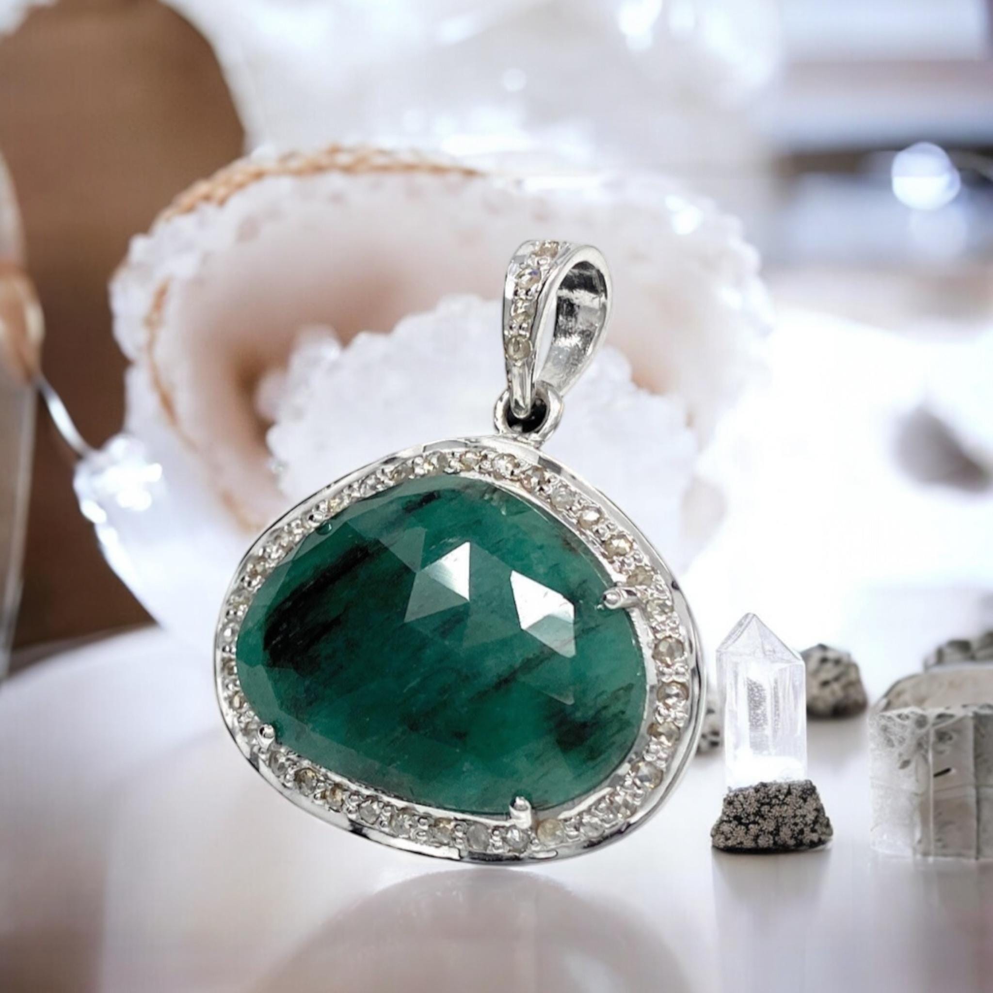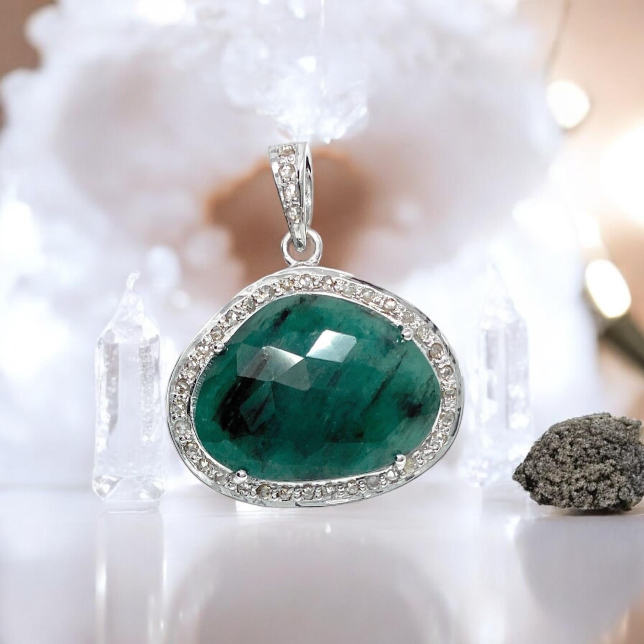 Discover the captivating power of the Pave Diamond Emerald Gemstone Pendant - a stunning piece of jewelry that combines natural beauty with spiritual healing.