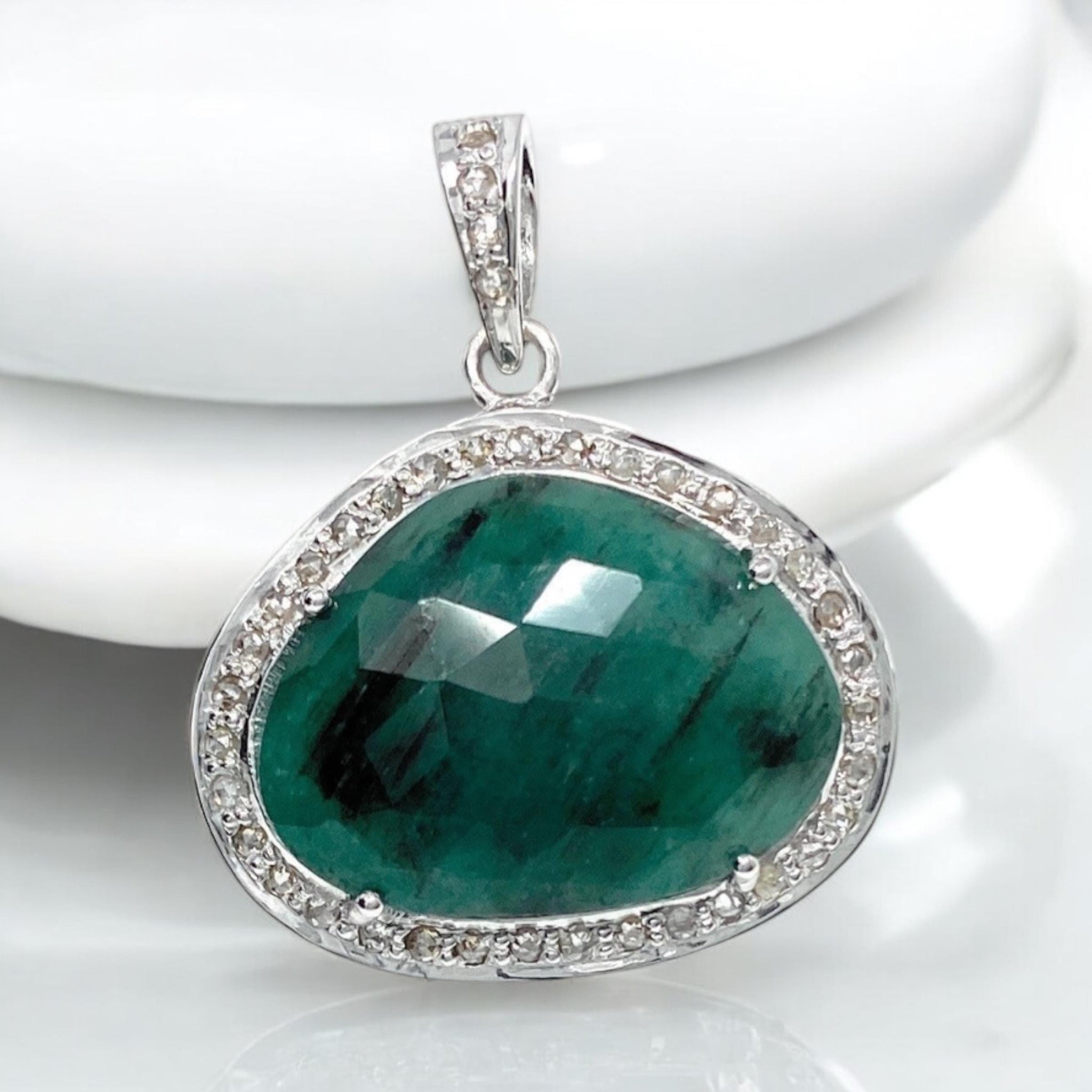 Emerald Pendant, May Birthstone Silver Pave Diamond Crystal Pendant, Heart Chakra Balancing Healing Jewelry, Spiritual Gemstone Pendant Gift