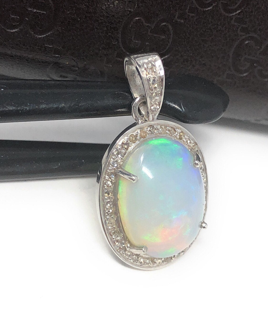 Sterling Silver Natural Genuine Ethiopian Opal Gemstone Pave Diamond Pendant