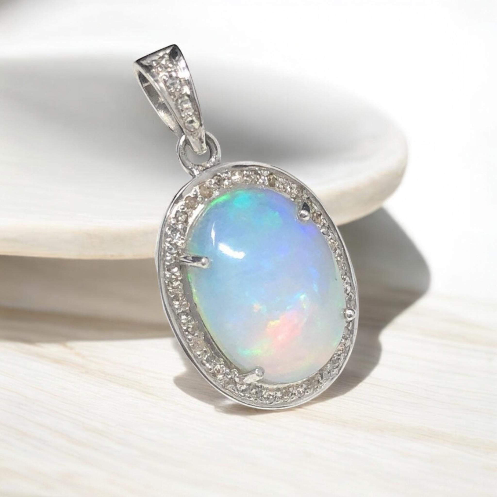 Ethiopian Opal Diamond Pendant, Sterling Silver Opal Gemstone Pendant, Spiritual Healing Chakra Jewelry, October Birthstone Crystal Pendant