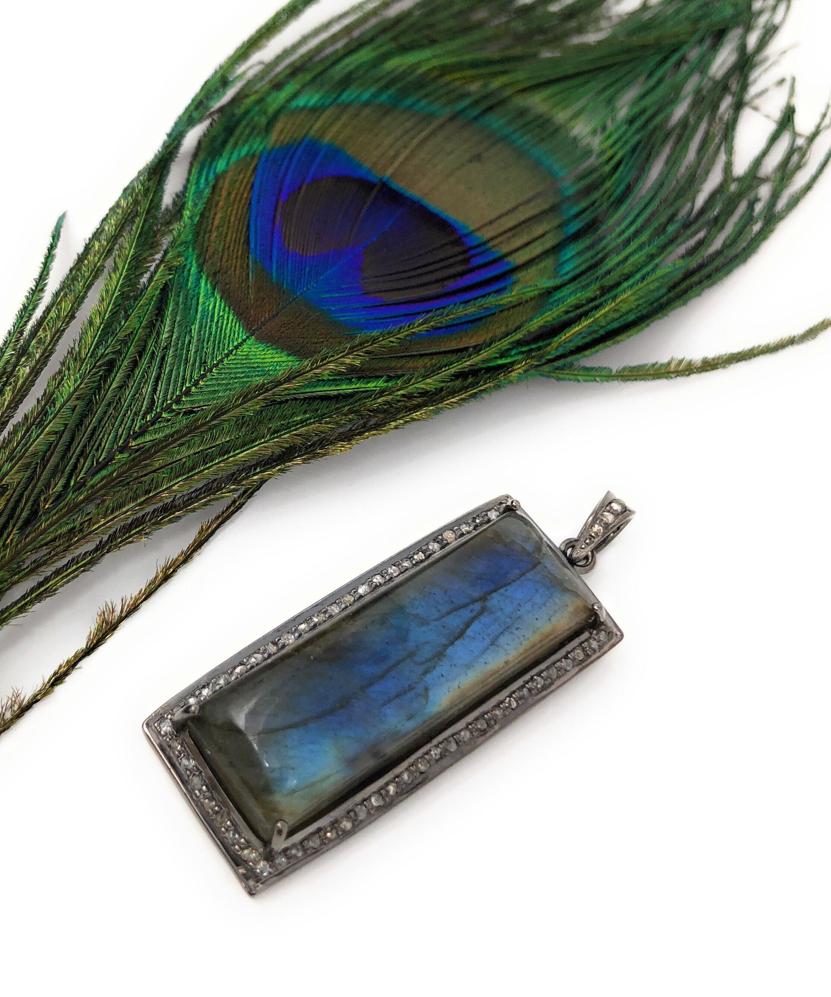 Discover the mystical power of labradorite with this captivating pave diamond pendant.