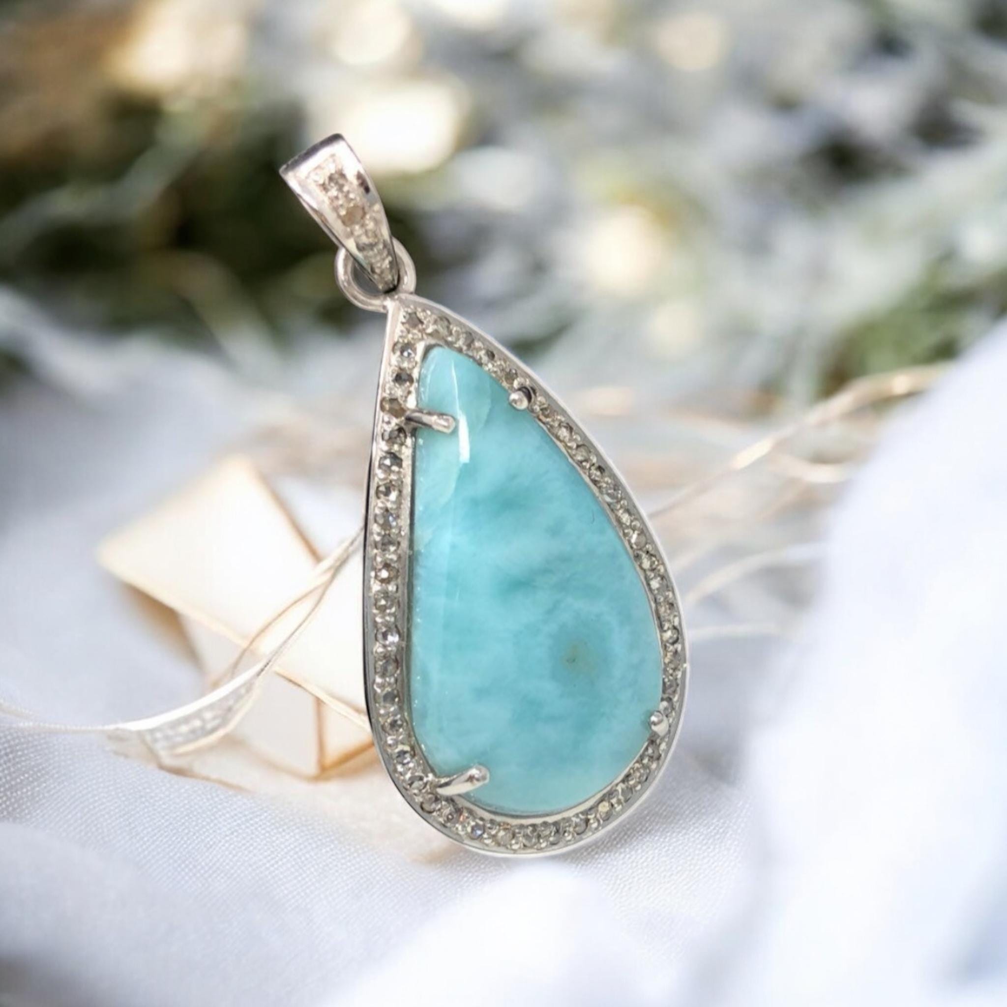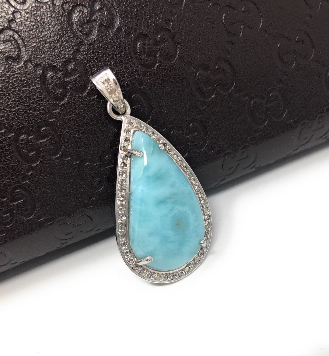 Sterling Silver Natural Larimar Gemstone Pave Diamond Handmade Pendant.