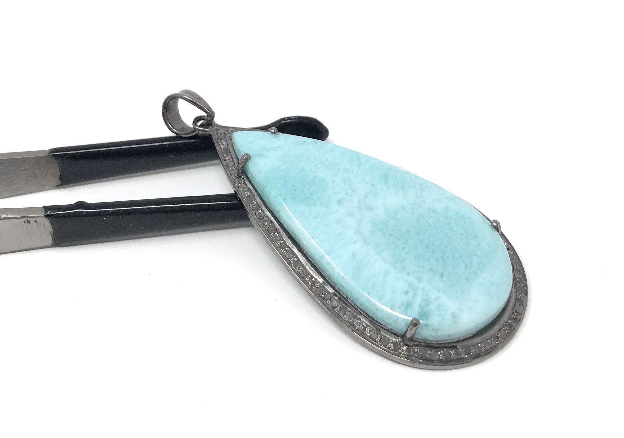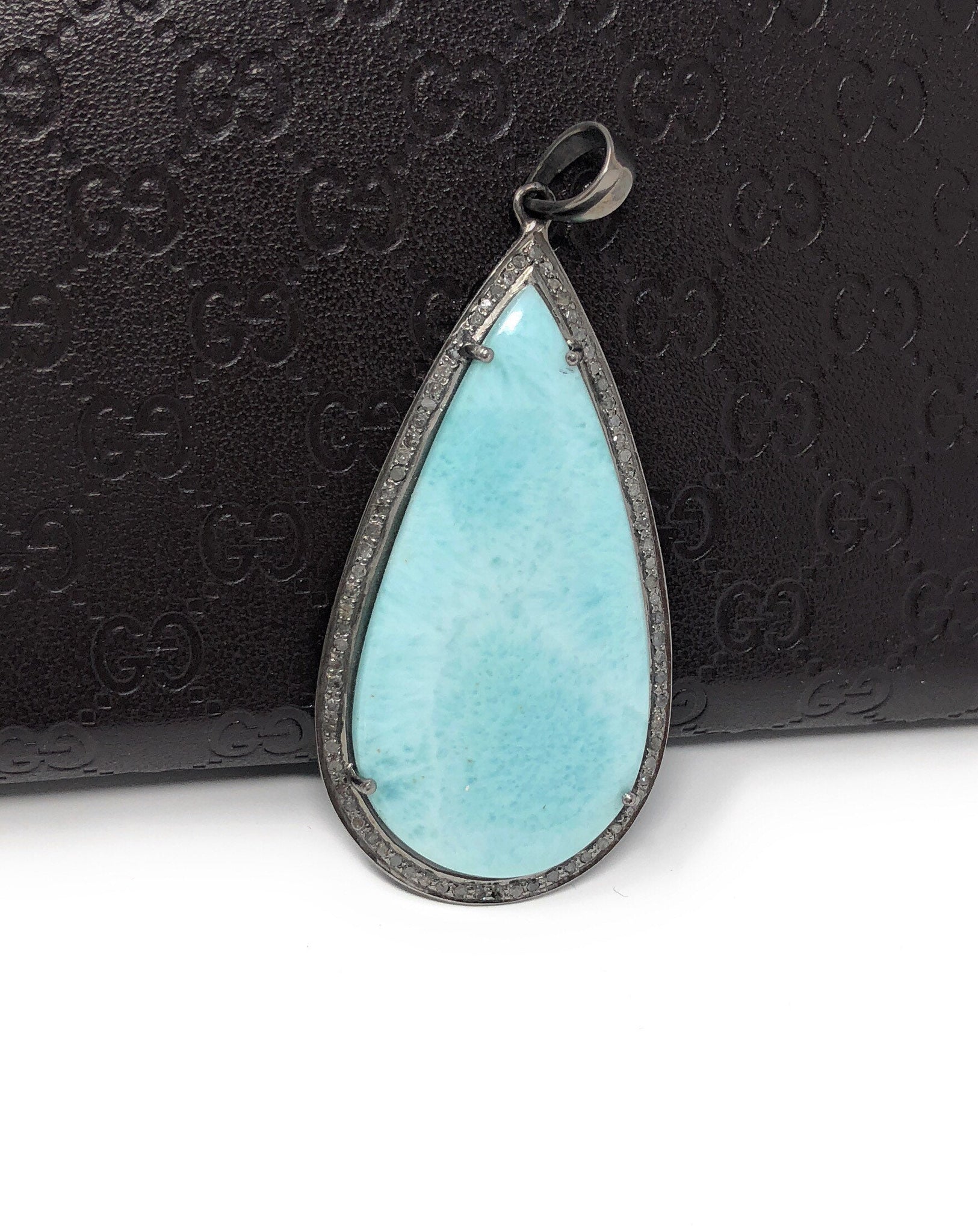 This beautiful Handmade AAA Grade Natural Larimar Gemstone Drop Shape Oxidized 925 Sterling Silver Large Pave Diamond Bezel Setting Pendant is an excellent choice for any occasion and makes a great gift for the loved ones.