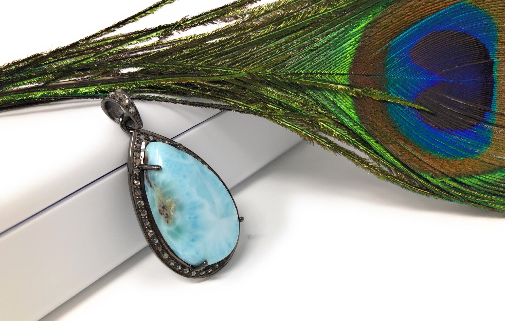 This beautiful Handmade AAA+ Grade Natural Larimar Gemstone Pear/Drop Shape Oxidized 925 Sterling Silver Large Pave Diamond Bezel Setting Pendant is an excellent choice for any occasion and makes a great gift for the loved ones.