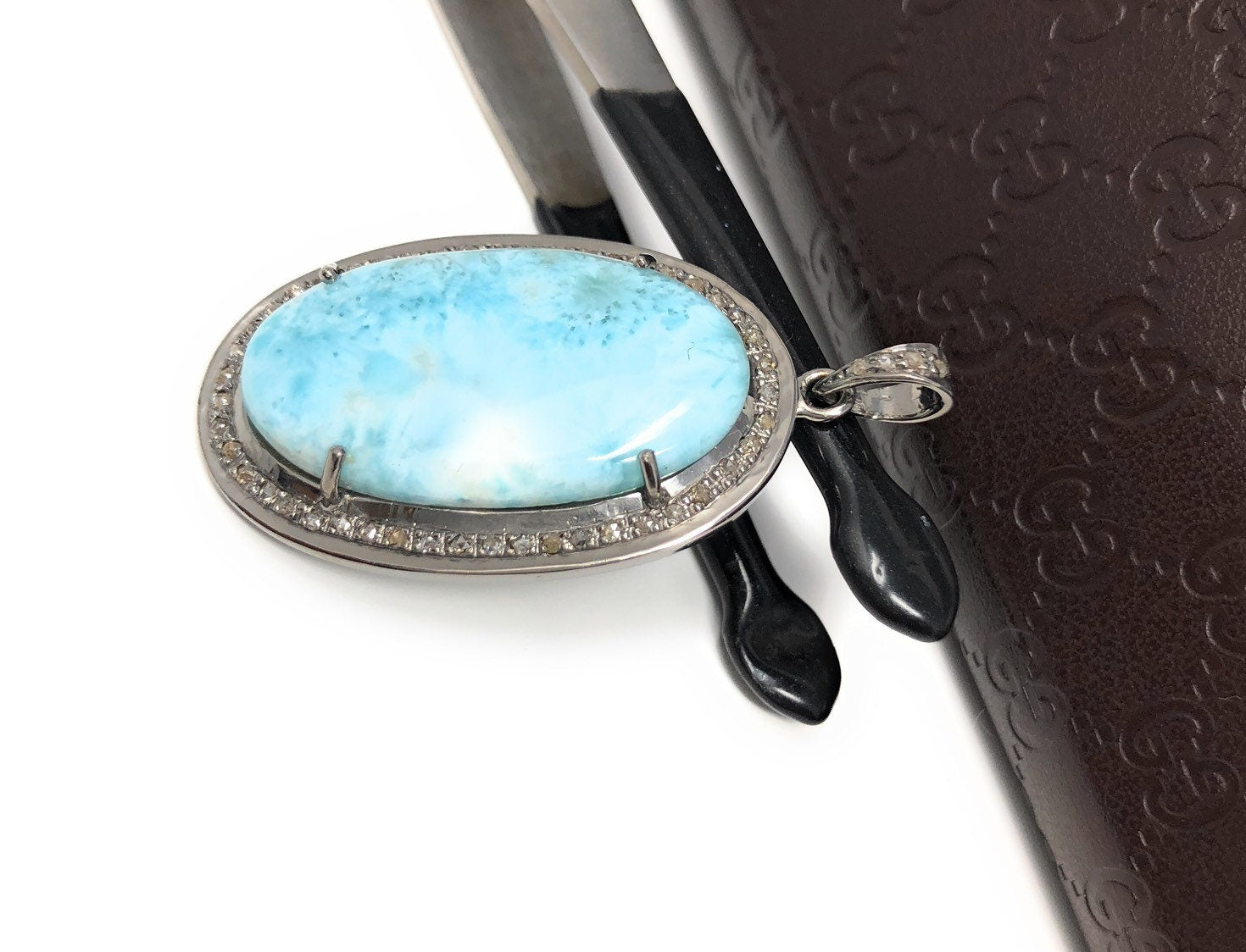 This beautiful Handmade AAA+ Grade Natural Larimar Gemstone Oval Shape Oxidized 925 Sterling Silver Large Pave Diamond Bezel Setting Pendant is an excellent choice for any occasion and makes a great gift for the loved ones.