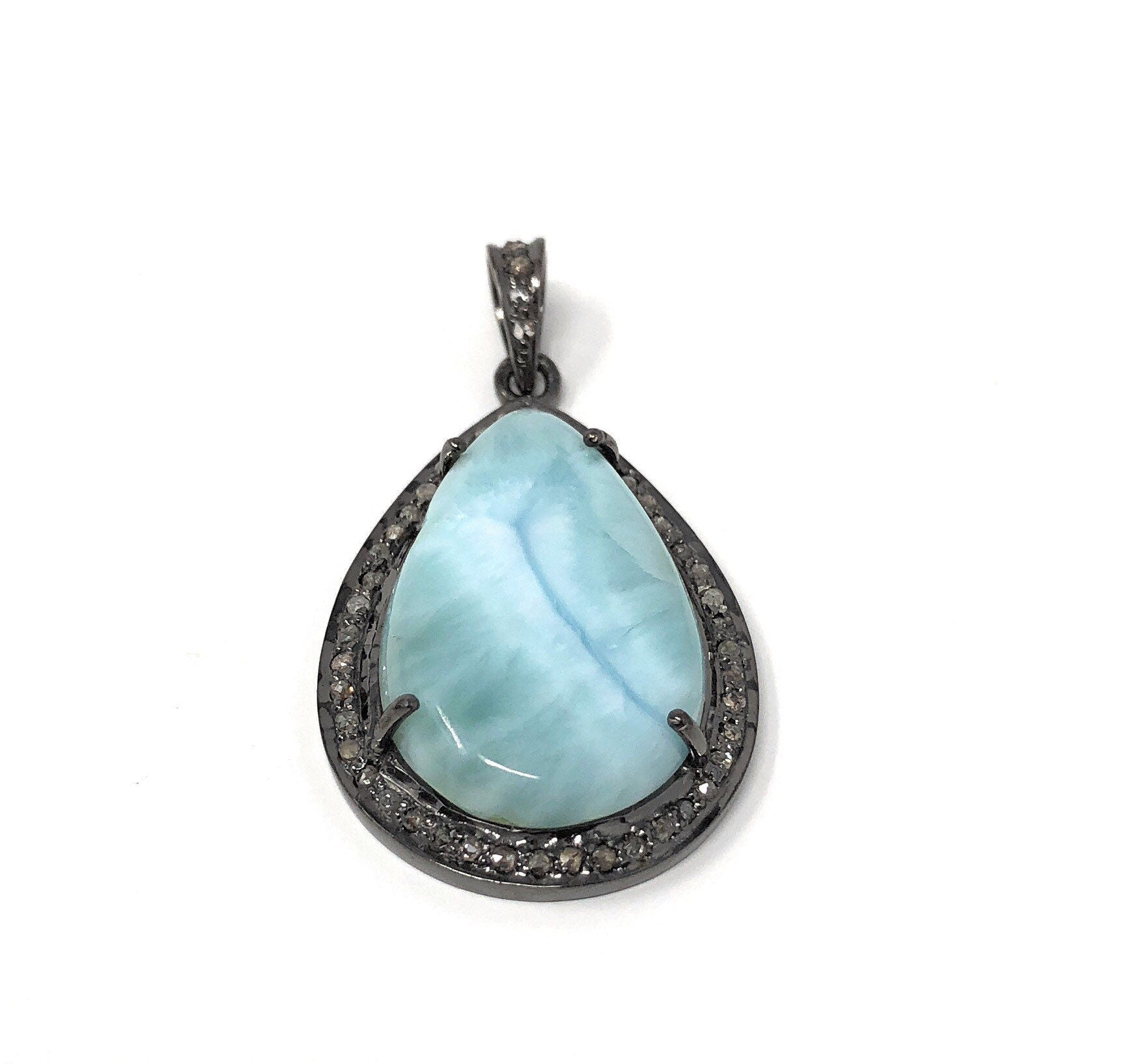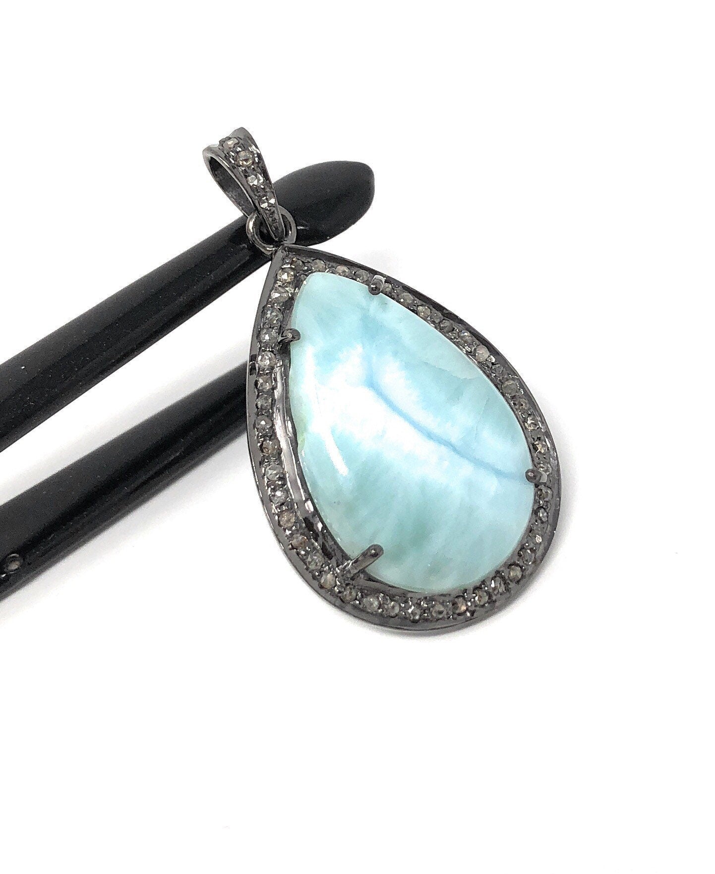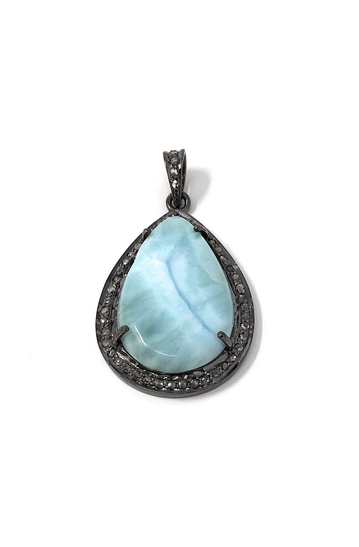 This beautiful Handmade AAA+ Grade Natural Larimar Gemstone Drop Shape Oxidized 925 Sterling Silver Large Pave Diamond Bezel Setting Pendant is an excellent choice for any occasion and makes a great gift for the loved ones.