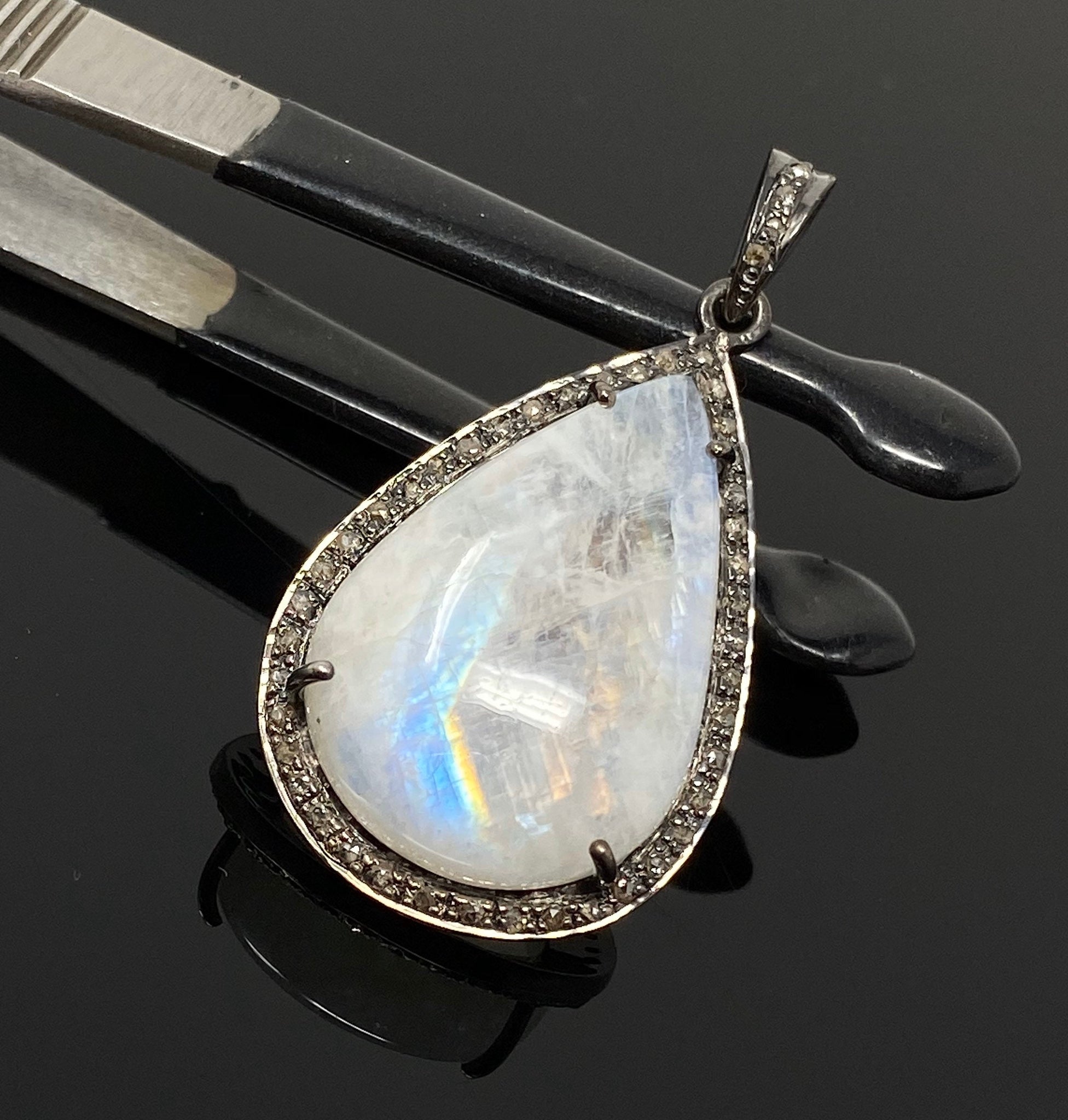 This exclusive beautiful Handmade AAA+ Grade Large Natural Rainbow Moonstone Gemstone Drop Shape Oxidized 925 Sterling Silver Pave Diamond Bezel Setting Pendant is an excellent choice for any occasion and makes a great gift for the loved ones.