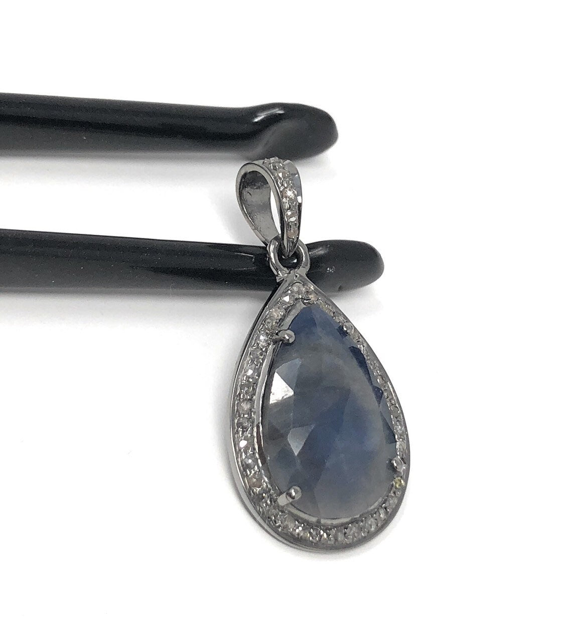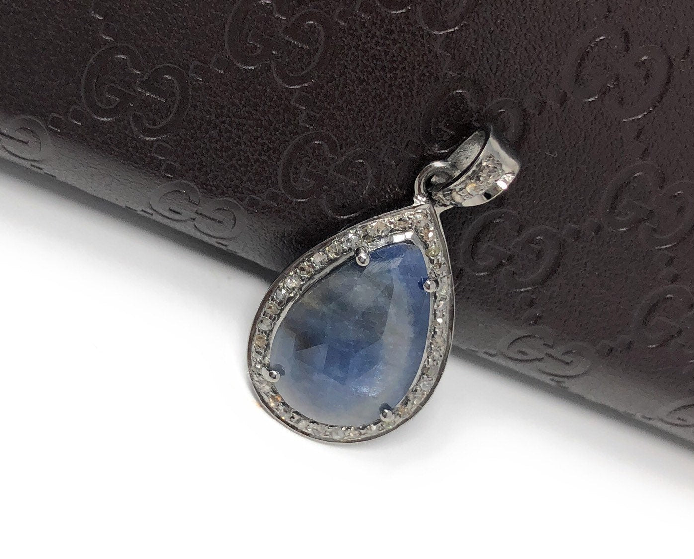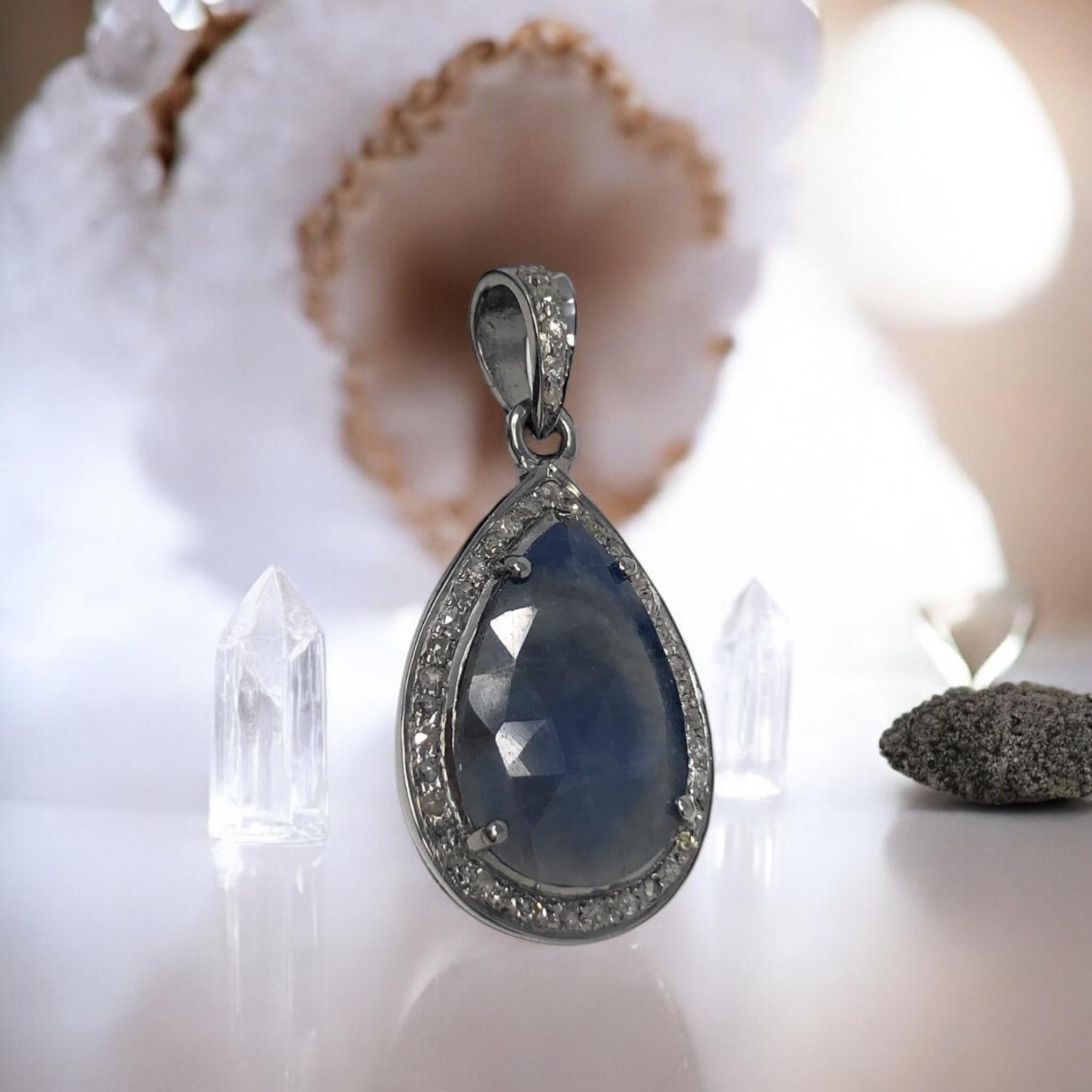 Natural Blue Sapphire Pave Diamond Pendant, Silver Pendant, Spiritual Healing Chakra Gemstone Jewelry, September Birthstone Crystal Pendant