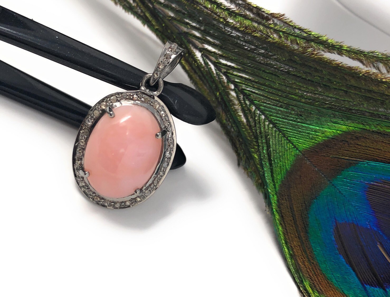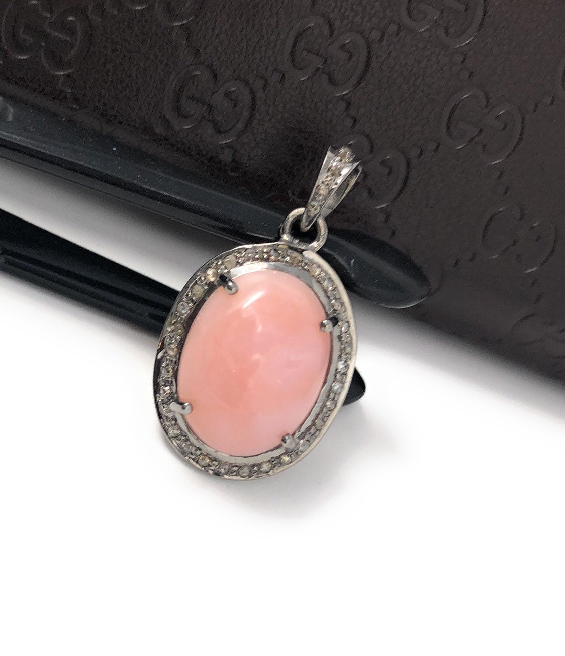 This beautiful Handmade AAA+ Grade Natural Peruvian Pink Opal Gemstone Oval Shape Oxidized 925 Sterling Silver Pave Diamond Pendant is an excellent choice for any occasion and makes a great gift for the loved ones.