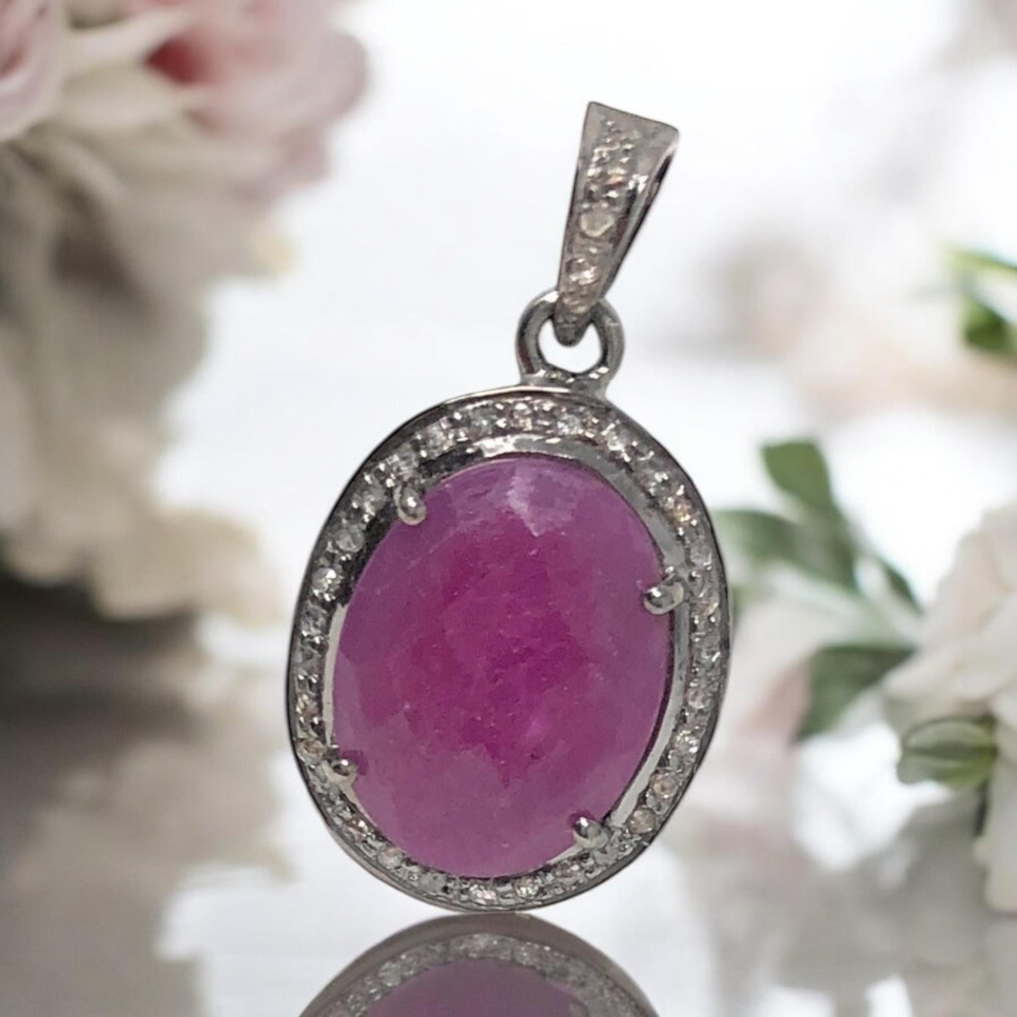 Sterling Silver Natural Gemstone Pink Sapphire Pave Diamond Pendant