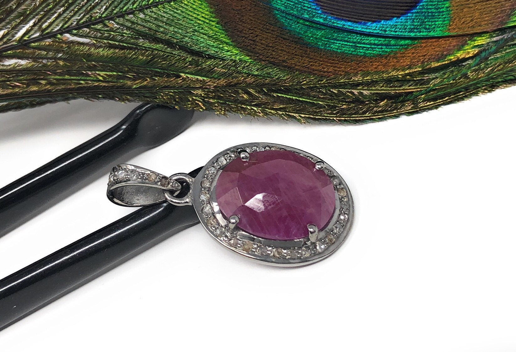 Sterling Silver Natural Gemstone Pink Sapphire Pave Diamond Pendant