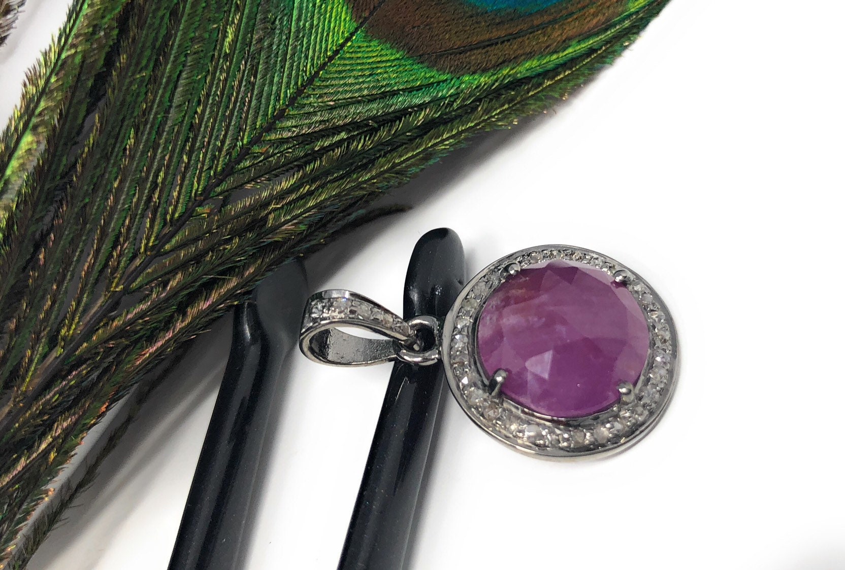 Pink Sapphire Pendant, Diamond Pendant, Silver Gemstone Pendant, Pave Diamond Pendant, Sterling Silver Pendant, Natural Sapphire Jewelry