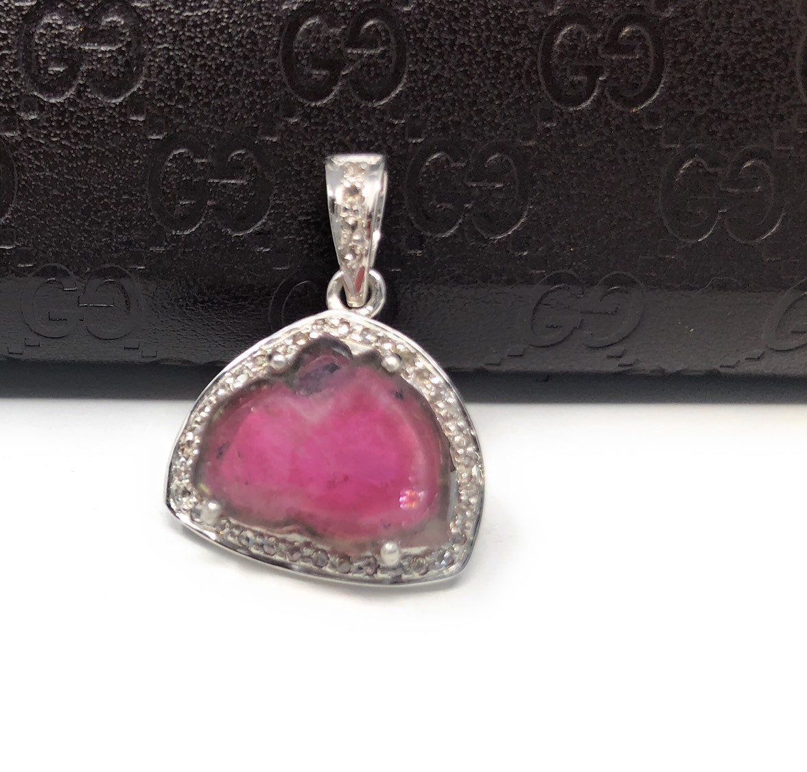 Sterling Silver Natural Watermelon Tourmaline Slice Pave Diamond Pendant at Wholesale Price .