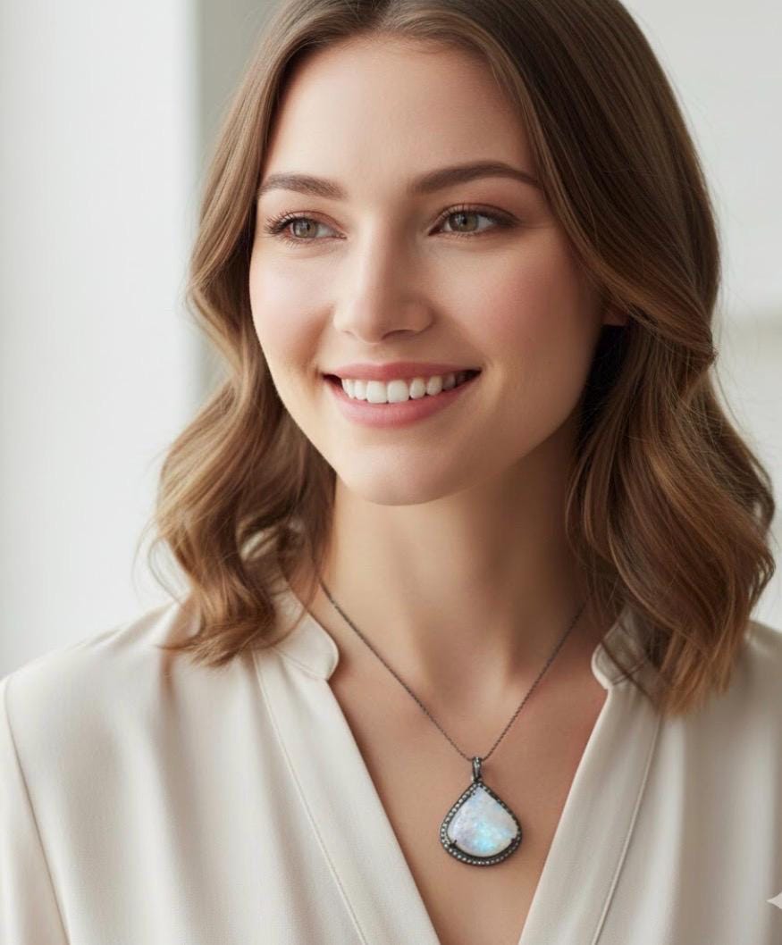 .Embrace your inner radiance with the Rainbow Moonstone Pave Diamond Pendant- a captivating piece that blends timeless elegance with transformative spiritual power.