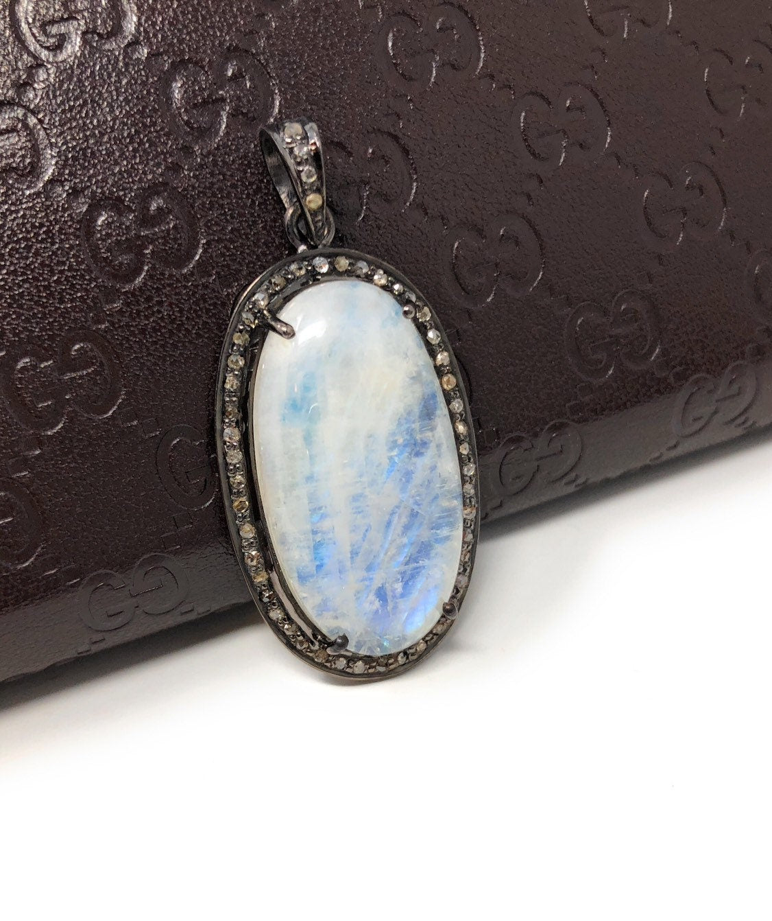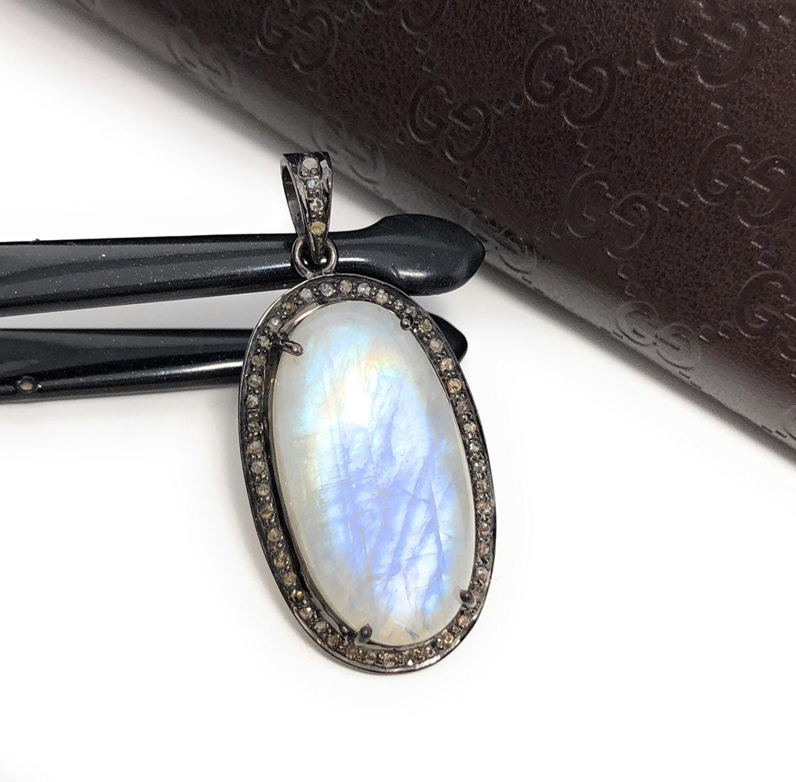 Rainbow Moonstone Gemstone Pendant, Diamond Pendant, Silver Pendant, Pave Diamond Pendant, Moonstone Pendant, Sterling Silver Jewelry