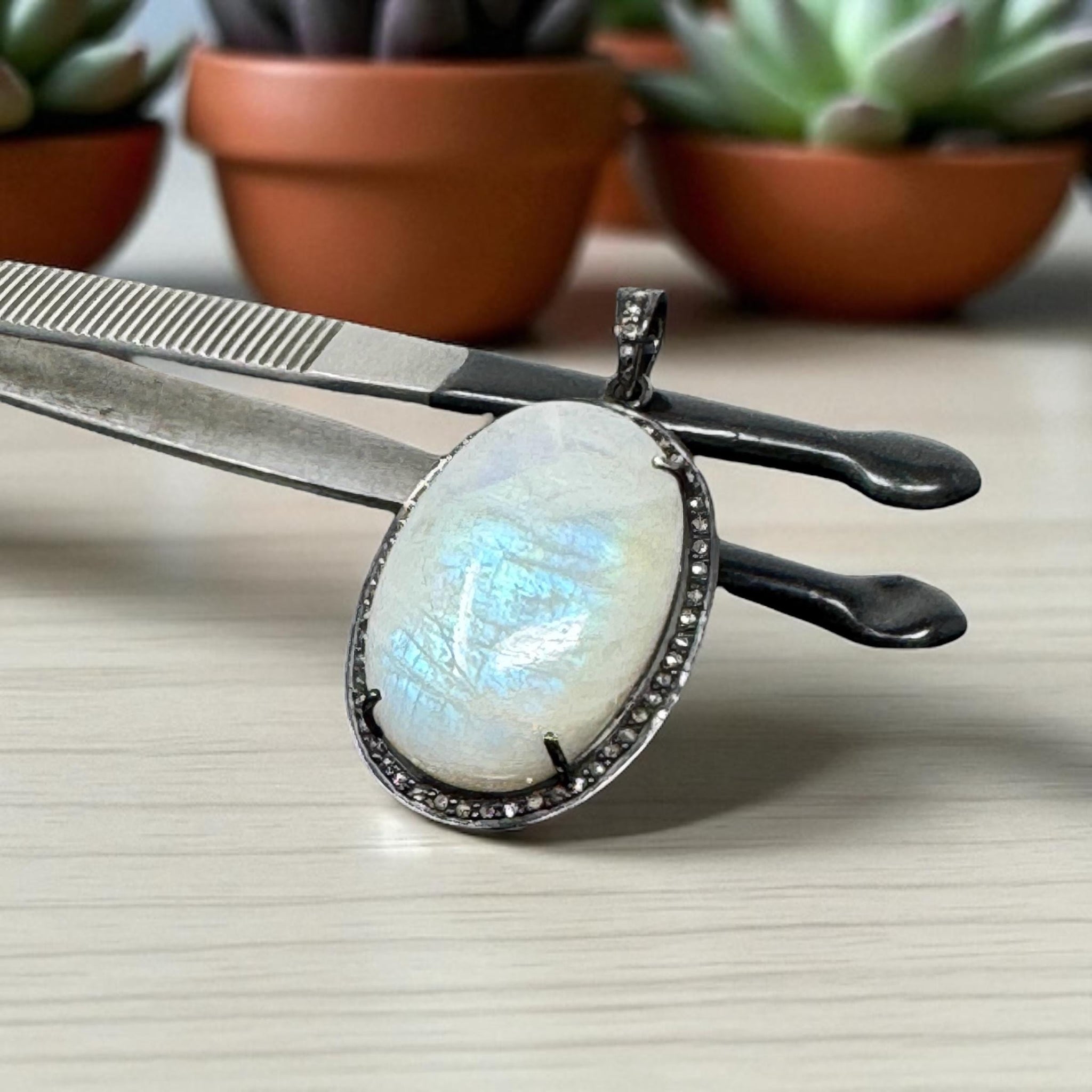 • Handmade with genuine rainbow moonstone and sparkling pave diamonds