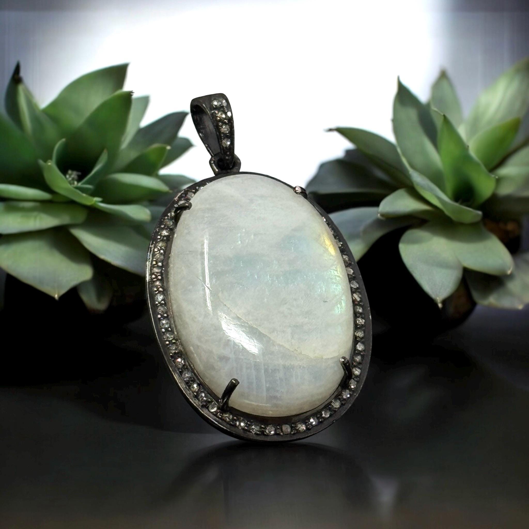 Rainbow Moonstone Pave Diamond Pendant, Silver Gemstone Pendant, Spiritual Healing Crystal Jewelry, Crown Chakra Jewelry, June Birthstone