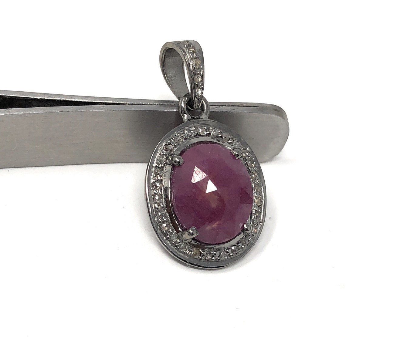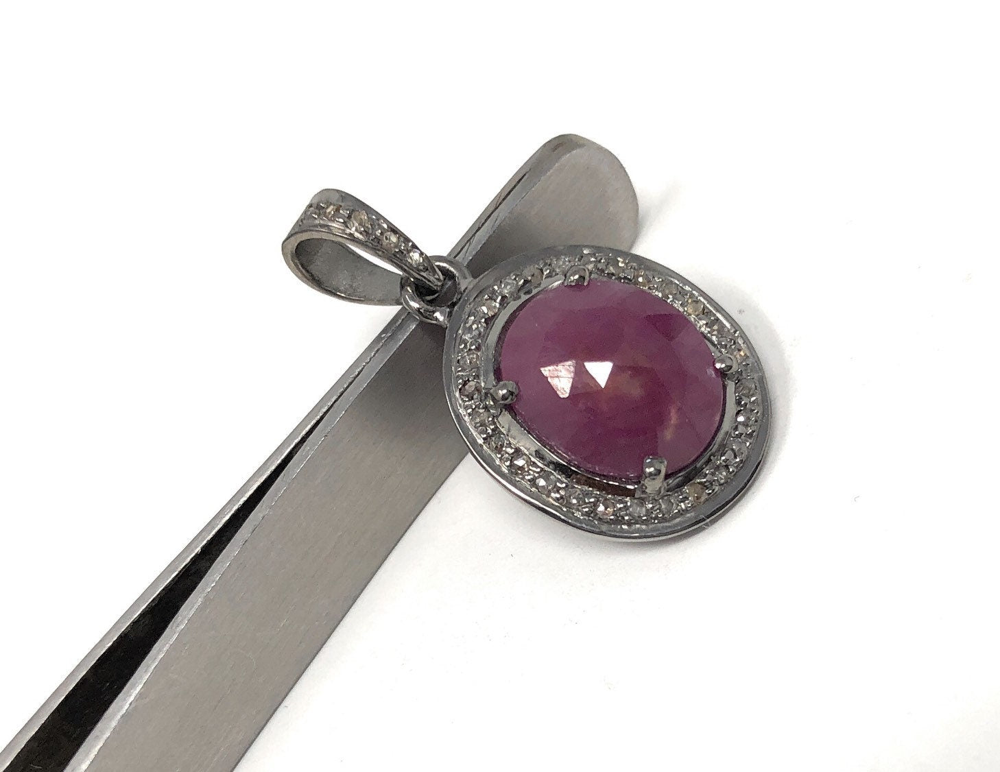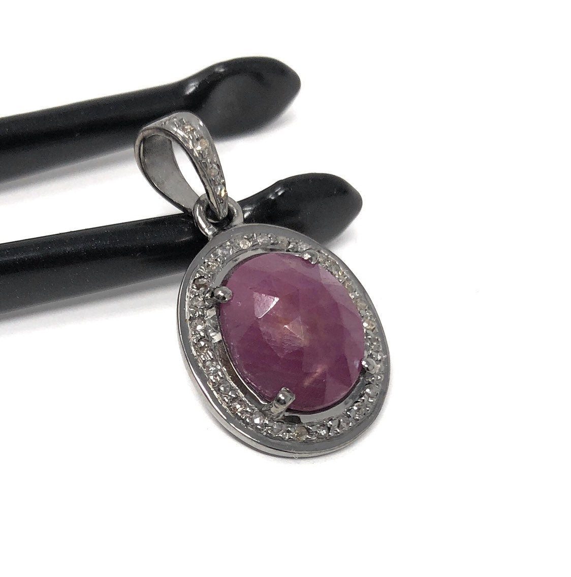 Sterling Silver Natural Gemstone Pink Sapphire Pave Diamond Pendant