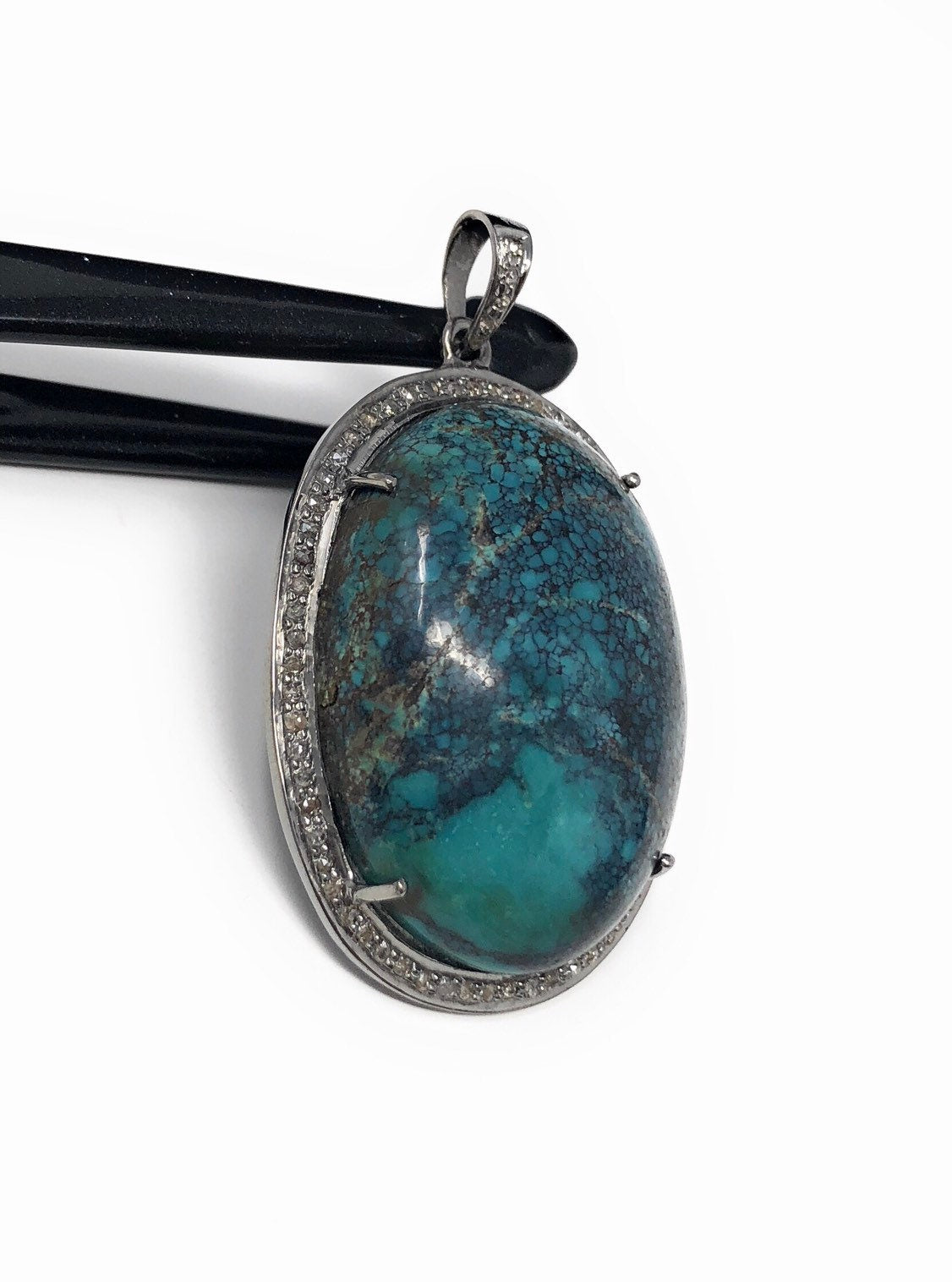 Sterling Silver Natural Gemstone Tibetan Turquoise Pave Diamond Pendant