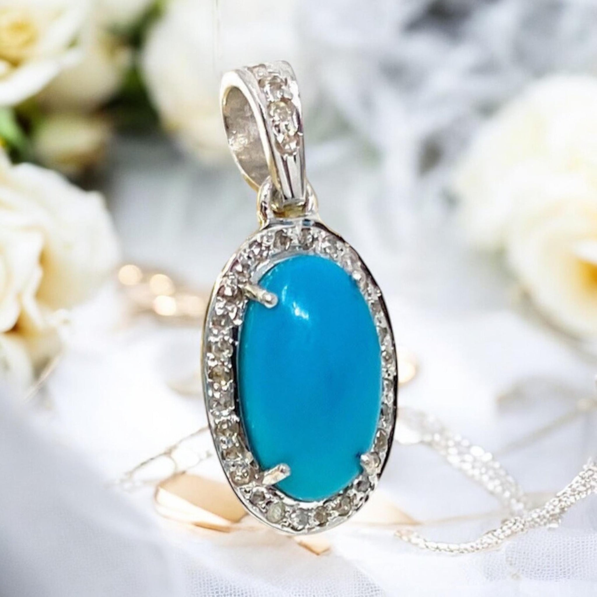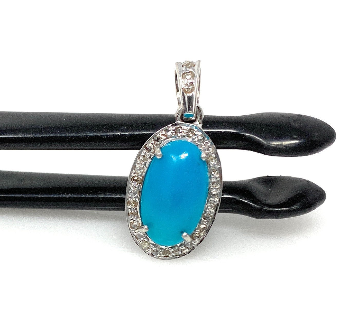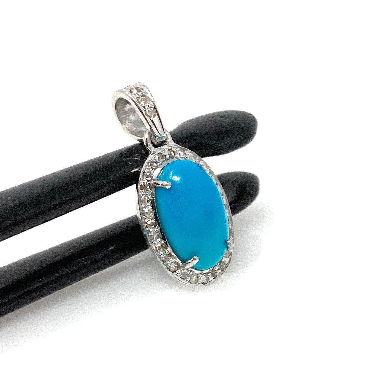 Natural Genuine Sleeping Beauty Turquoise Gemstone Sterling Silver Pave Diamond Pendant