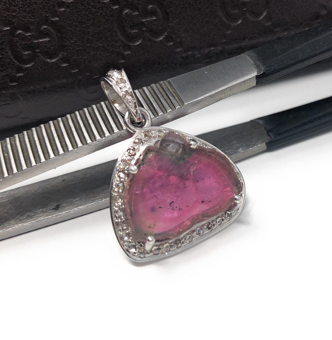 Watermelon Tourmaline Diamond Pendant, Gemstone Pendant, Sterling Silver Watermelon Tourmaline Slice Pendant, October Birthstone Jewelry