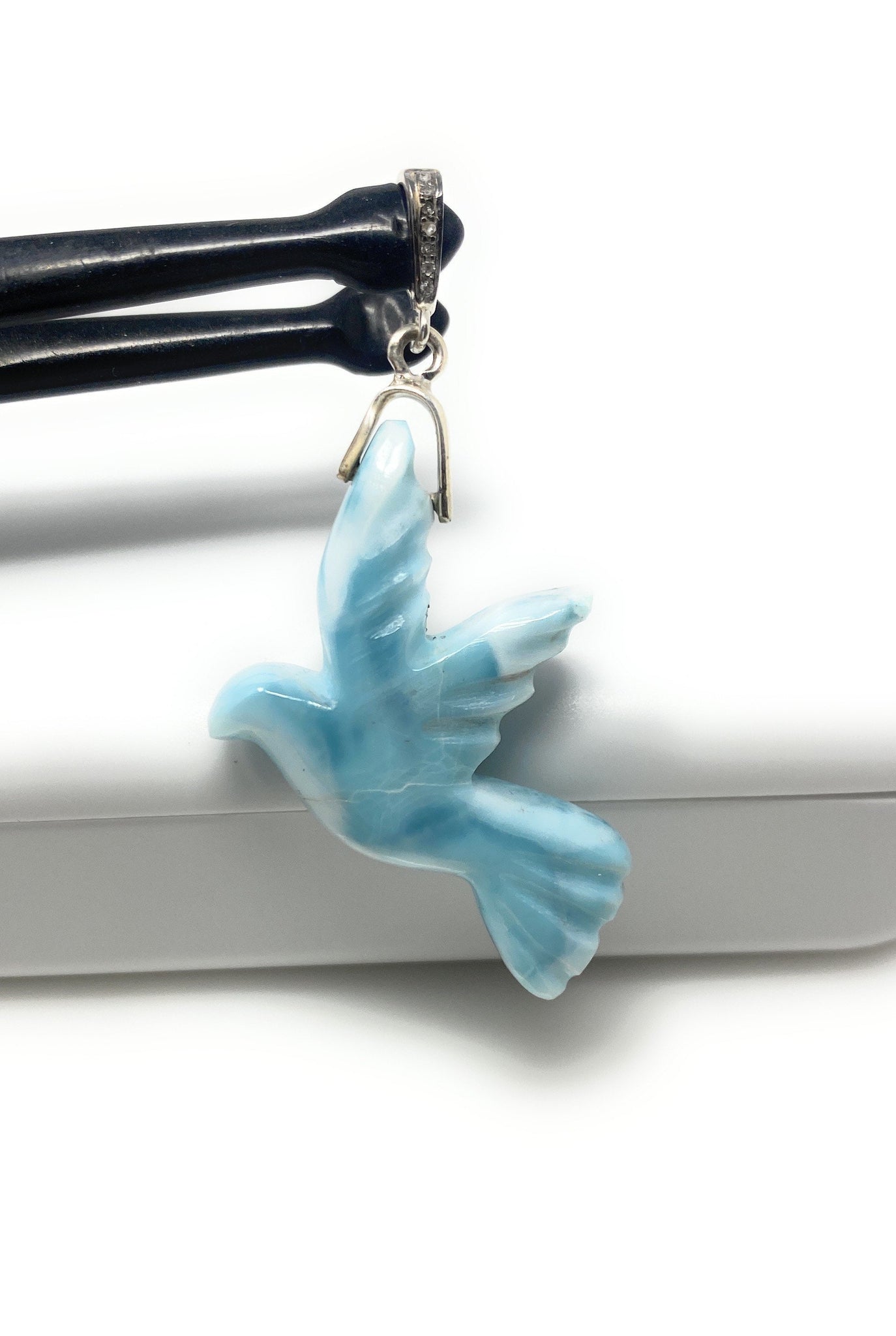 10g Rare Large Larimar Bird Pave Diamond Pendant, Silver Bohemian Jewelry, Dominican Republic Hand Carved Larimar Bird Pendant