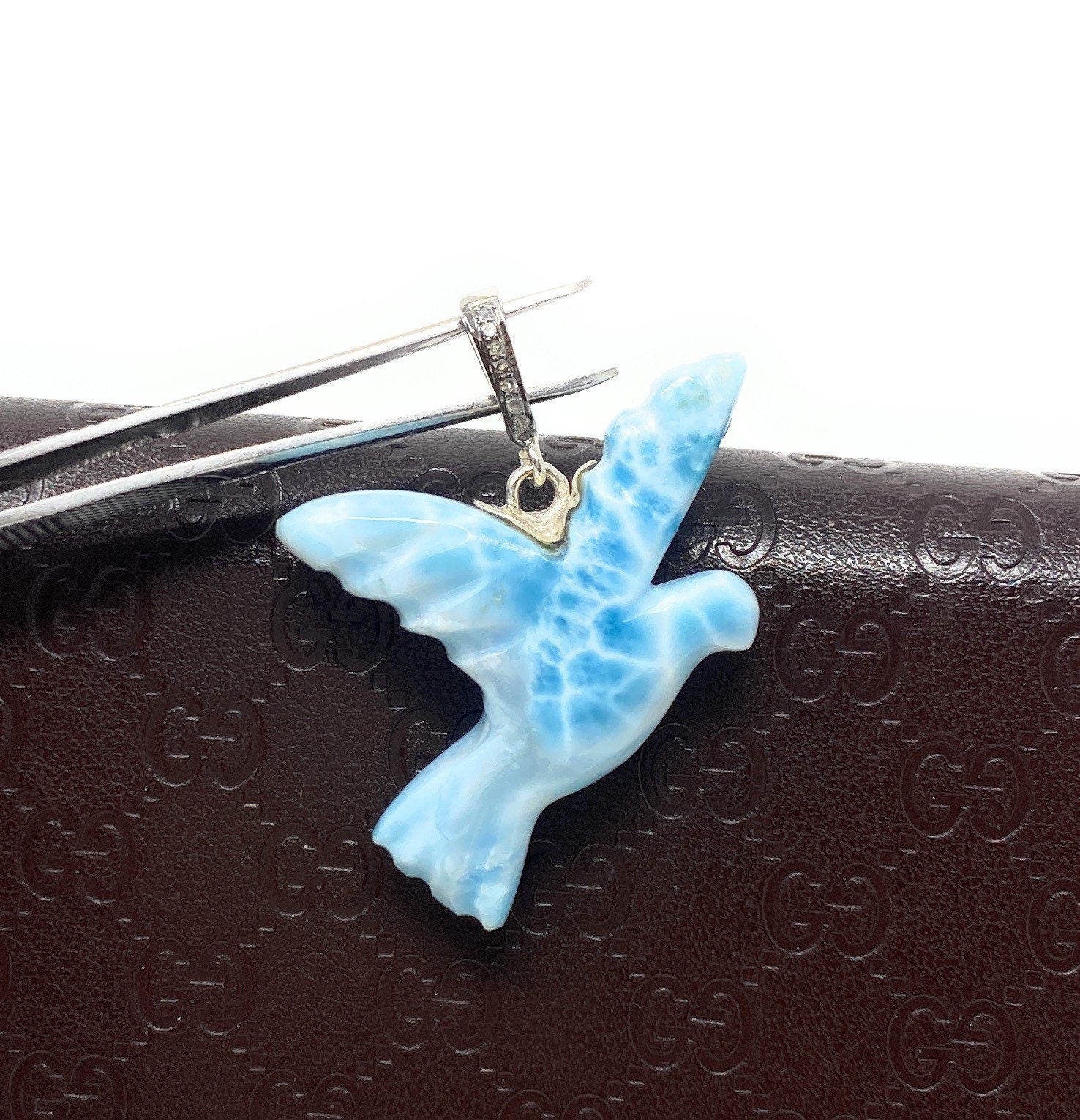 12g Rare Large Larimar Bird Pave Diamond Pendant, Silver Bohemian Jewelry, Dominican Republic Larimar Dove Pendant