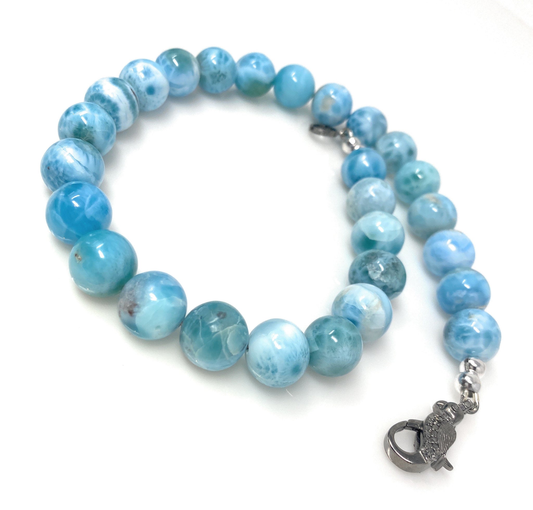 Larimar is the embodiment of the tranquil Sea and Sky energies. Its soft, soothing blues and calming turquoise is streaked with white patterns that resemble sunlight dancing beneath Caribbean waters. It brings the ancient wisdom of Atlantis and the healing power of dolphins to harmonize the body and soul.