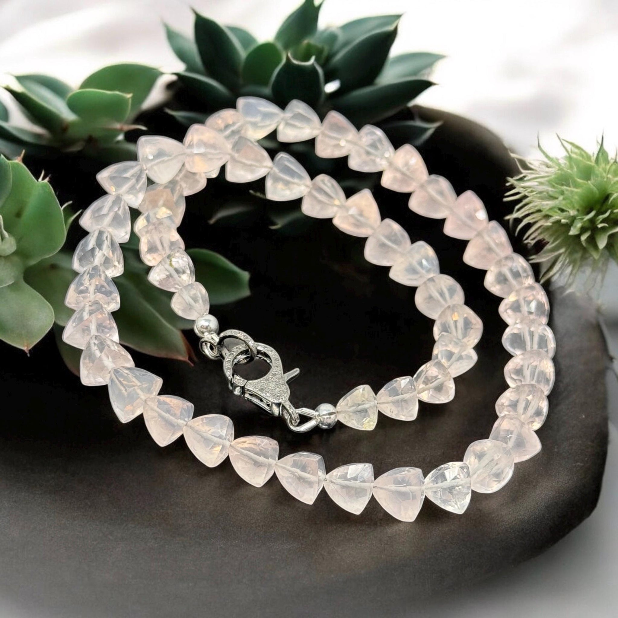 Natural Rose Quartz Trillion Shape Beaded Handmade Necklace with Genuine Pave Diamonds in the Clasp.