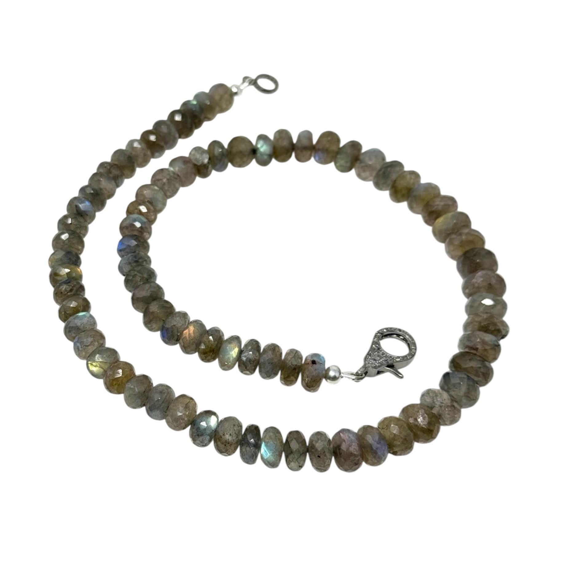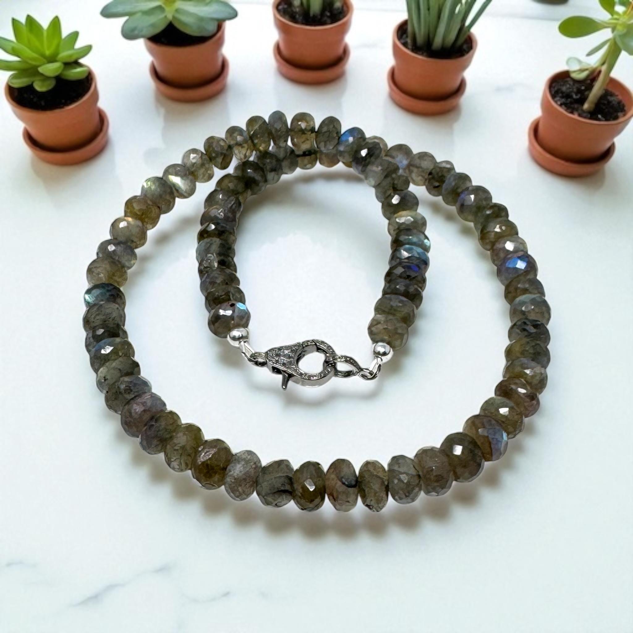 Discover the captivating beauty and transformative powers of Labradorite with this stunning beaded gemstone necklace. Crafted with genuine Labradorite stones and a dazzling pave diamond clasp, this spiritual jewelry piece is a must-have for any crystal enthusiast or style connoisseur.