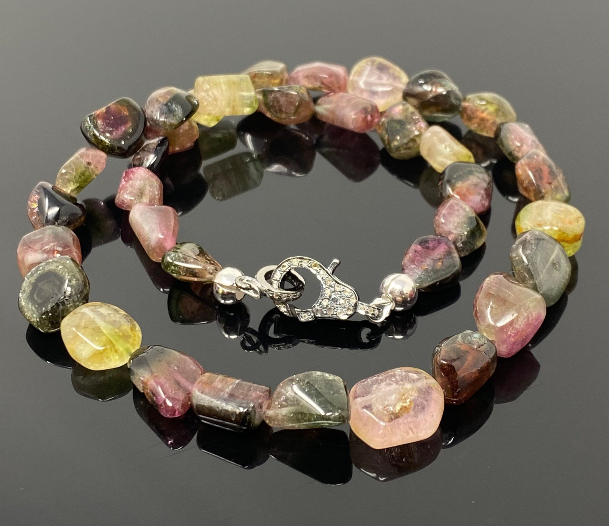 17.25” Tourmaline Necklace with Pave Diamond Clasp, Natural Bicolor Tourmaline Gemstone Necklace, Spiritual Healing Crystal Chakra Jewelry