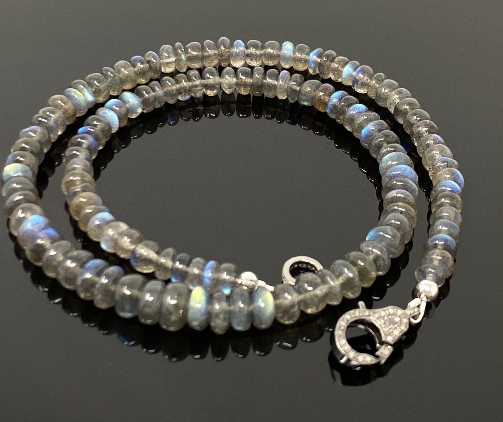 This Necklace is Handmade by using Smooth Natural Labradorite Gemstone Beads and Genuine Pave Diamond Clasp .