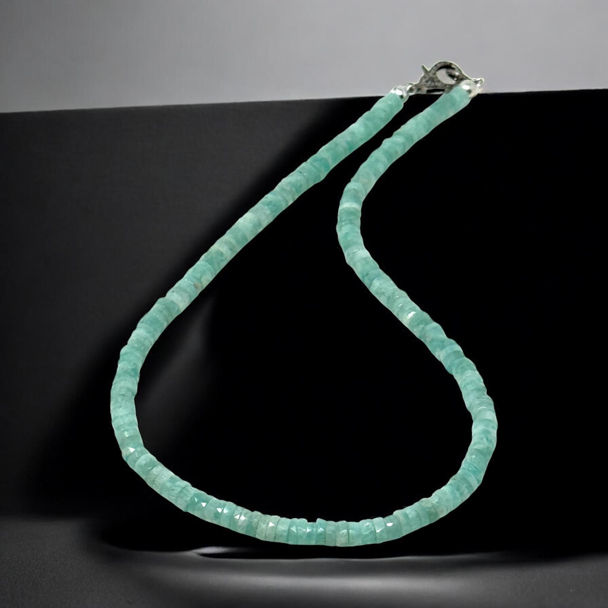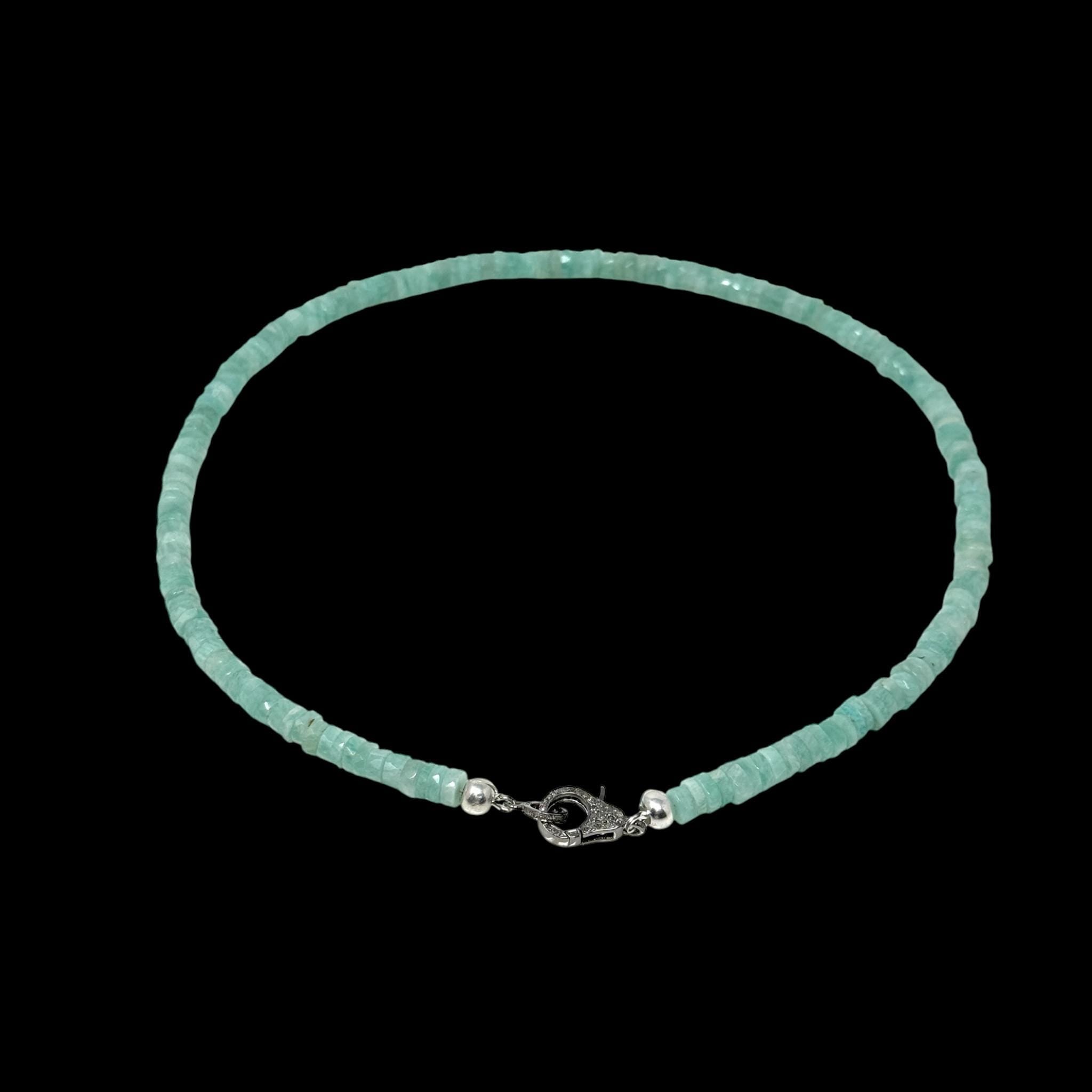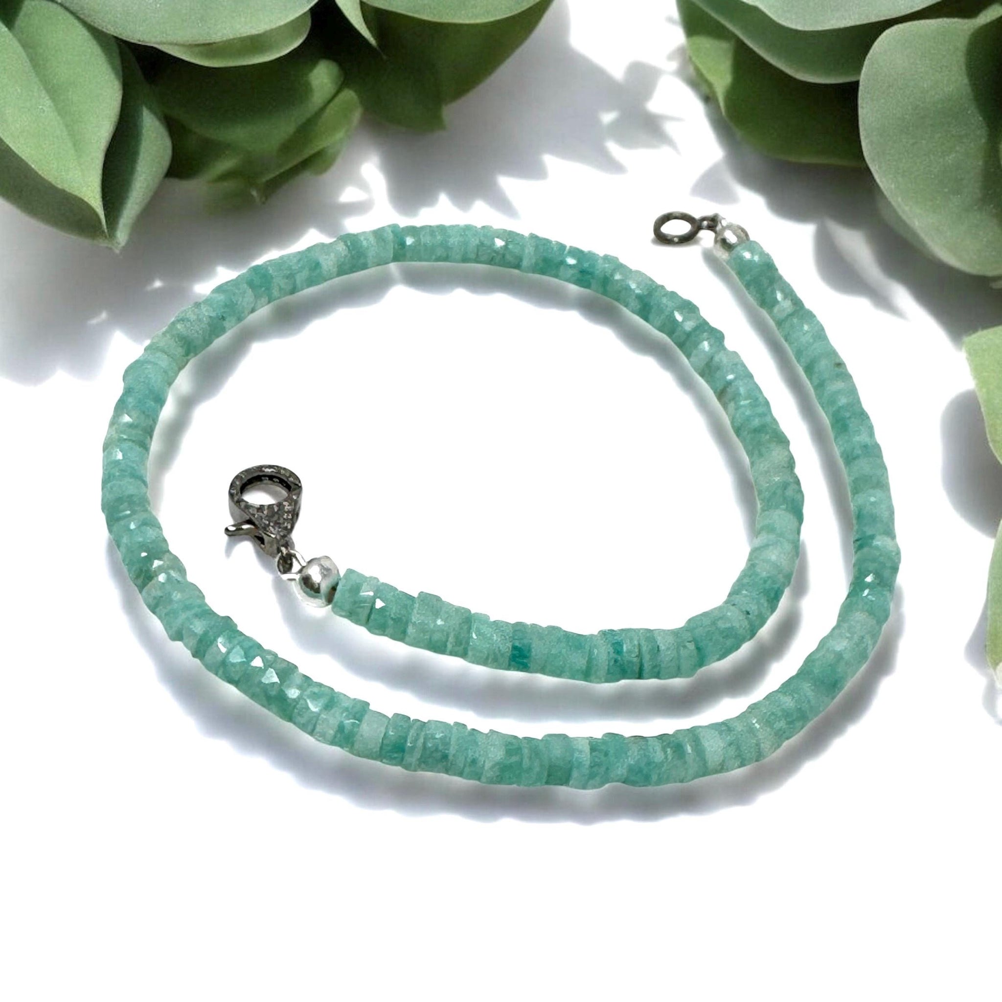 Natural Peruvian Amazonite Faceted Heishi Beaded Handmade Necklace with Genuine Pave Diamonds in the Clasp.