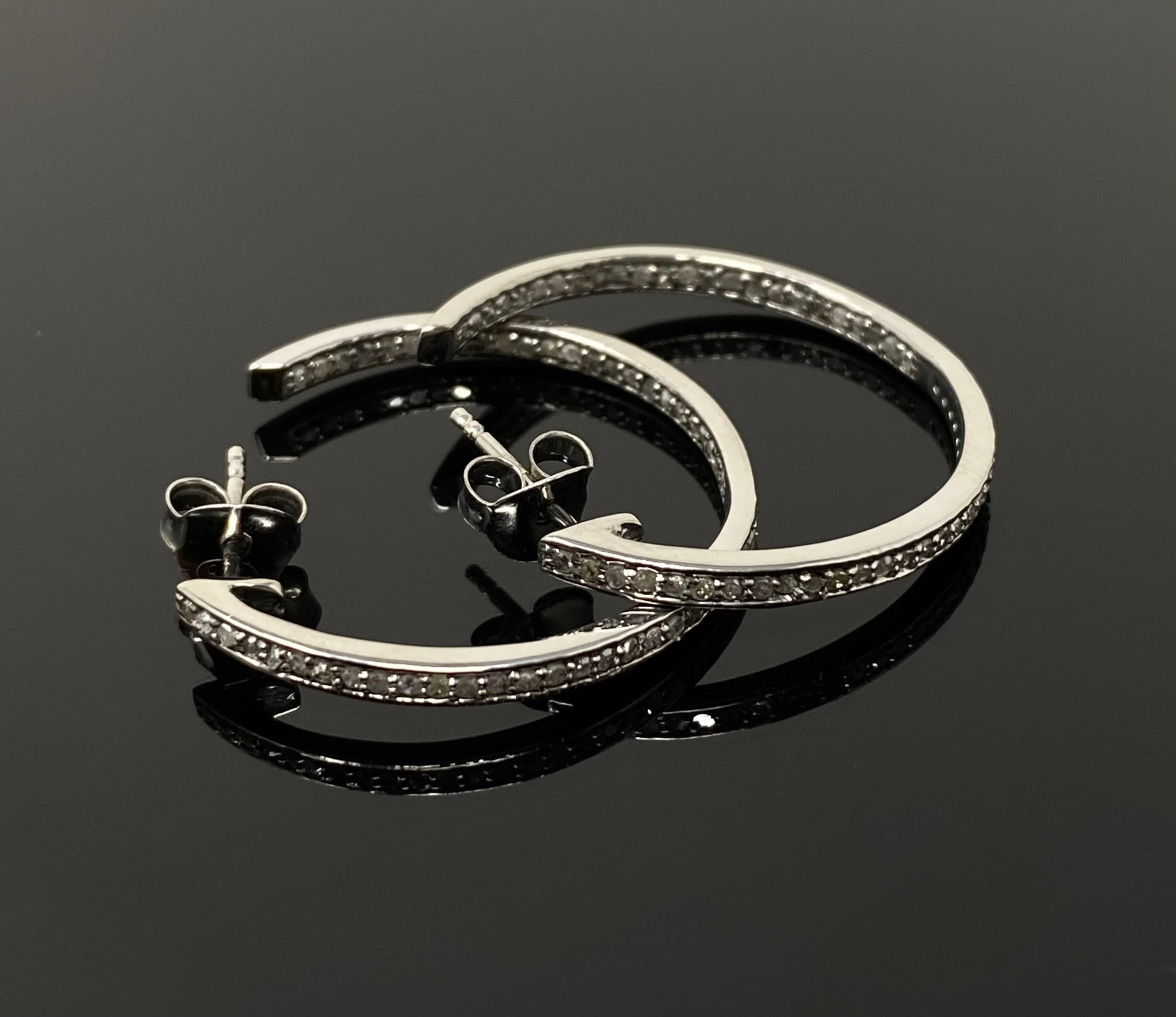25mm Diamond Hoop Earrings, Black Rhuthenium over Sterling Silver Pave Diamond Earrings, Silver Hoop Earrings