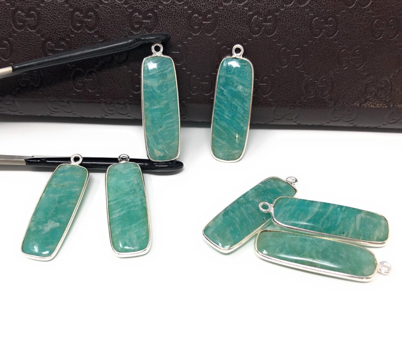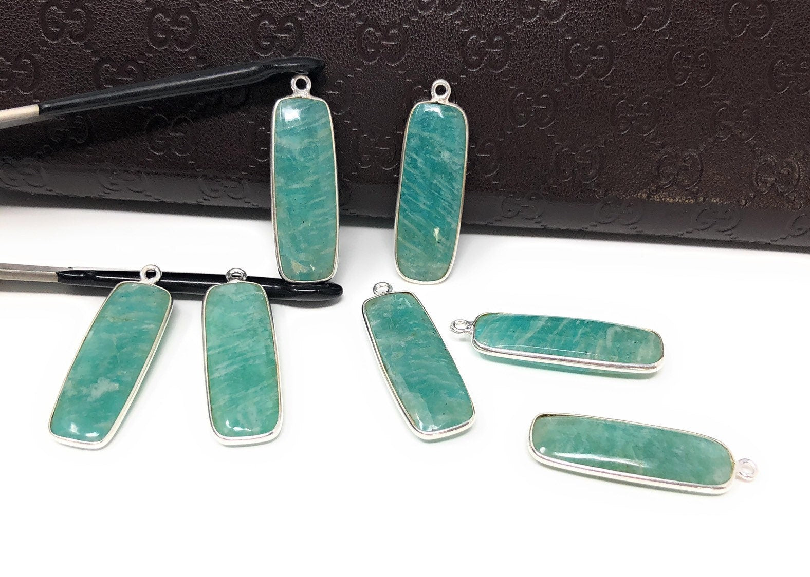 5 Pcs Sterling Silver Natural Gemstone Amazonite Bezel Set Double Sided Briolette Bar Charm Jewelry Findings for Jewelry Making at Wholesale Price.