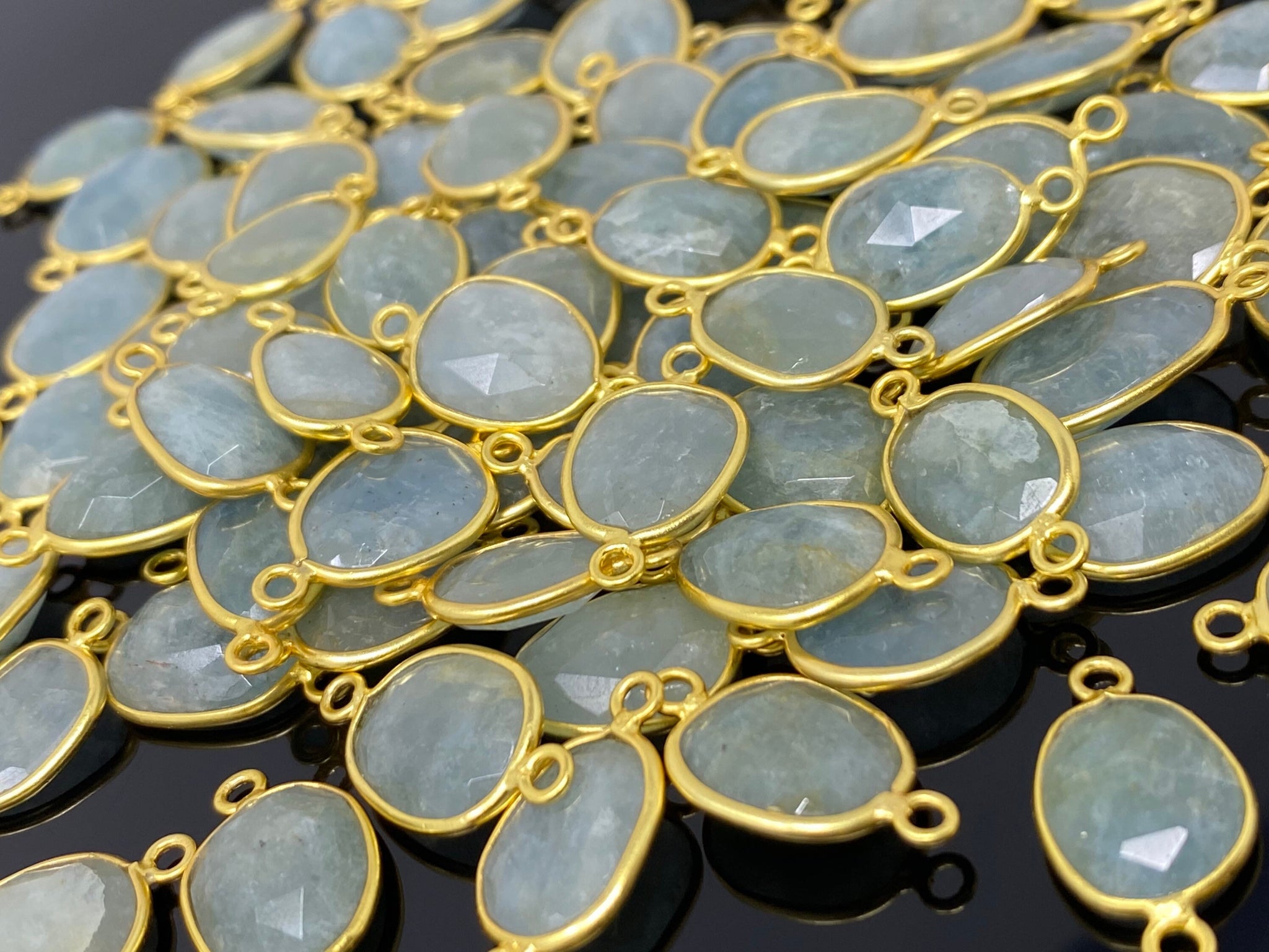 14K Gold Plated over 925 Sterling Silver Natural Gemstone Aquamarine Handmade Free Form Shape Faceted Connector Flat Back for Jewelry Making at Wholesale Price.