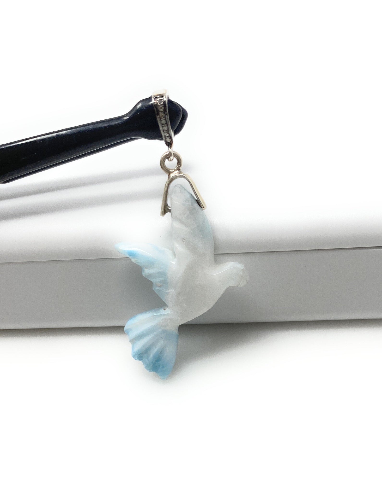 8g Rare Larimar Bird Pave Diamond Pendant, Silver Bohemian Jewelry, Dominican Republic Hand Carved Larimar Dove Pendant