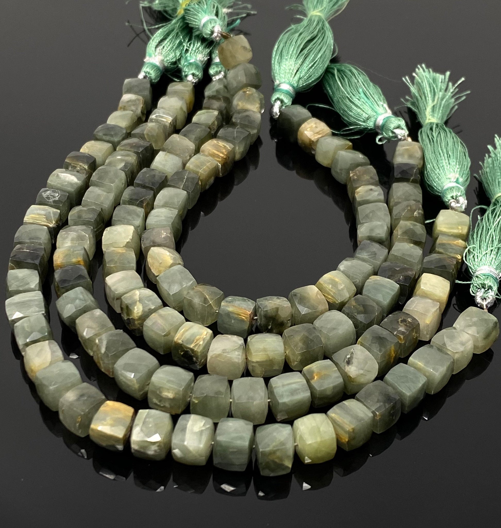 Cats Eye Gemstone Beads, Natural Chrysoberyl Green Cats Eye Beads, 3D Cube Box Beads, Bulk Wholesale Beads, Jewelry Supplies, 8" Strand