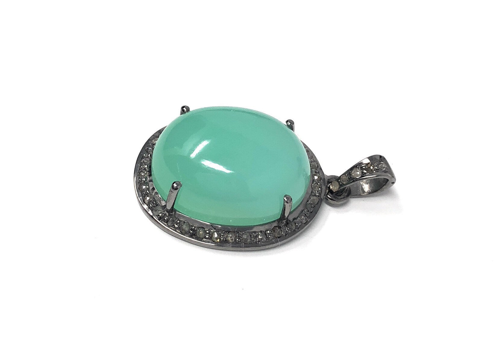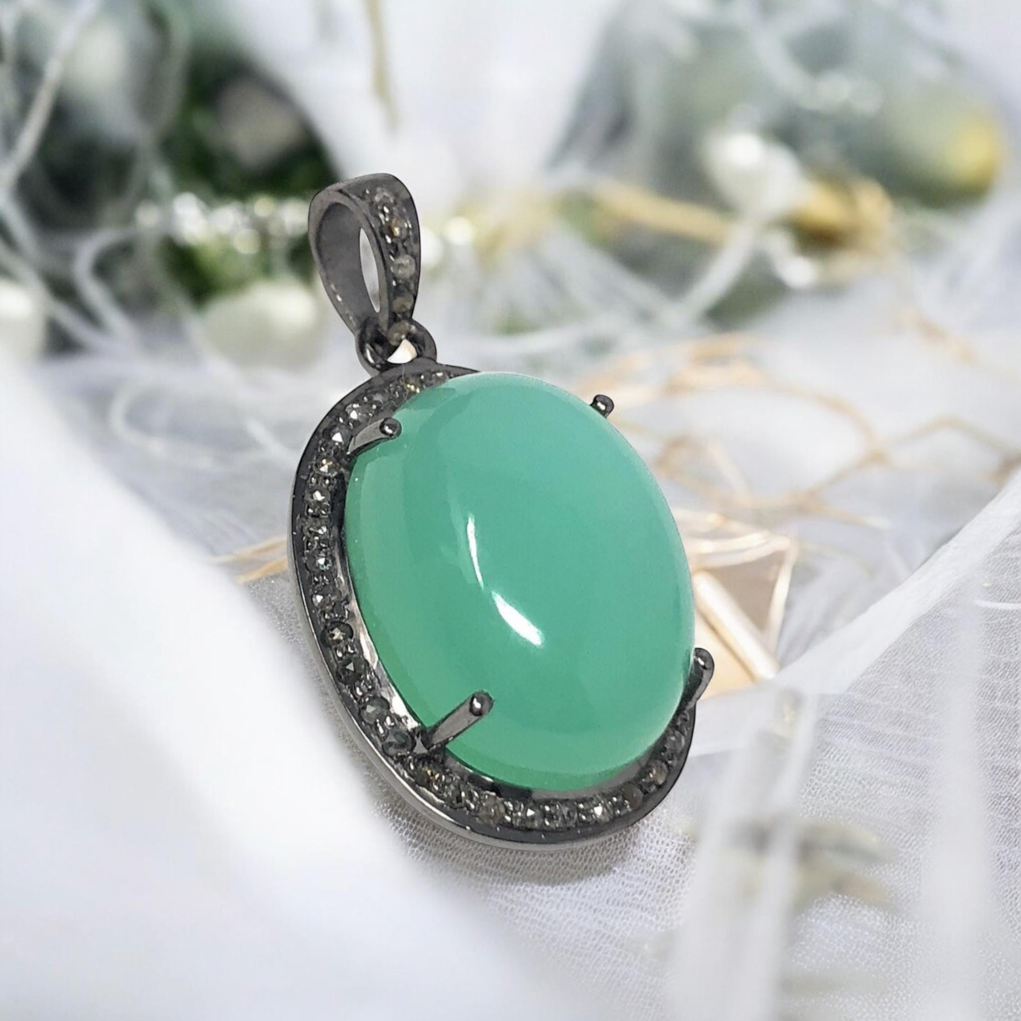 Sterling Silver Natural Chrysoprase Gemstone Pave Diamond Pendant