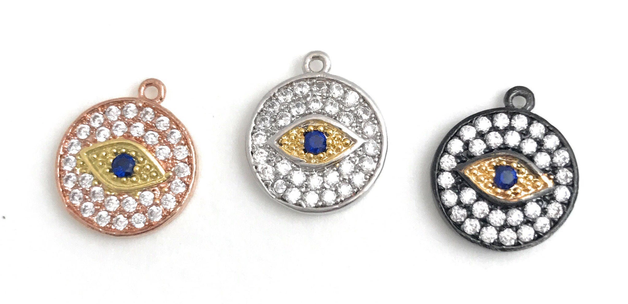 Evil Eye Pave Disc Charm CZ Micro Pave Round Shape for Jewelry Making at Wholesale Price available in Platinum Plated, Gold Plated, Rose Gold Plated and Gun Metal Plated.
