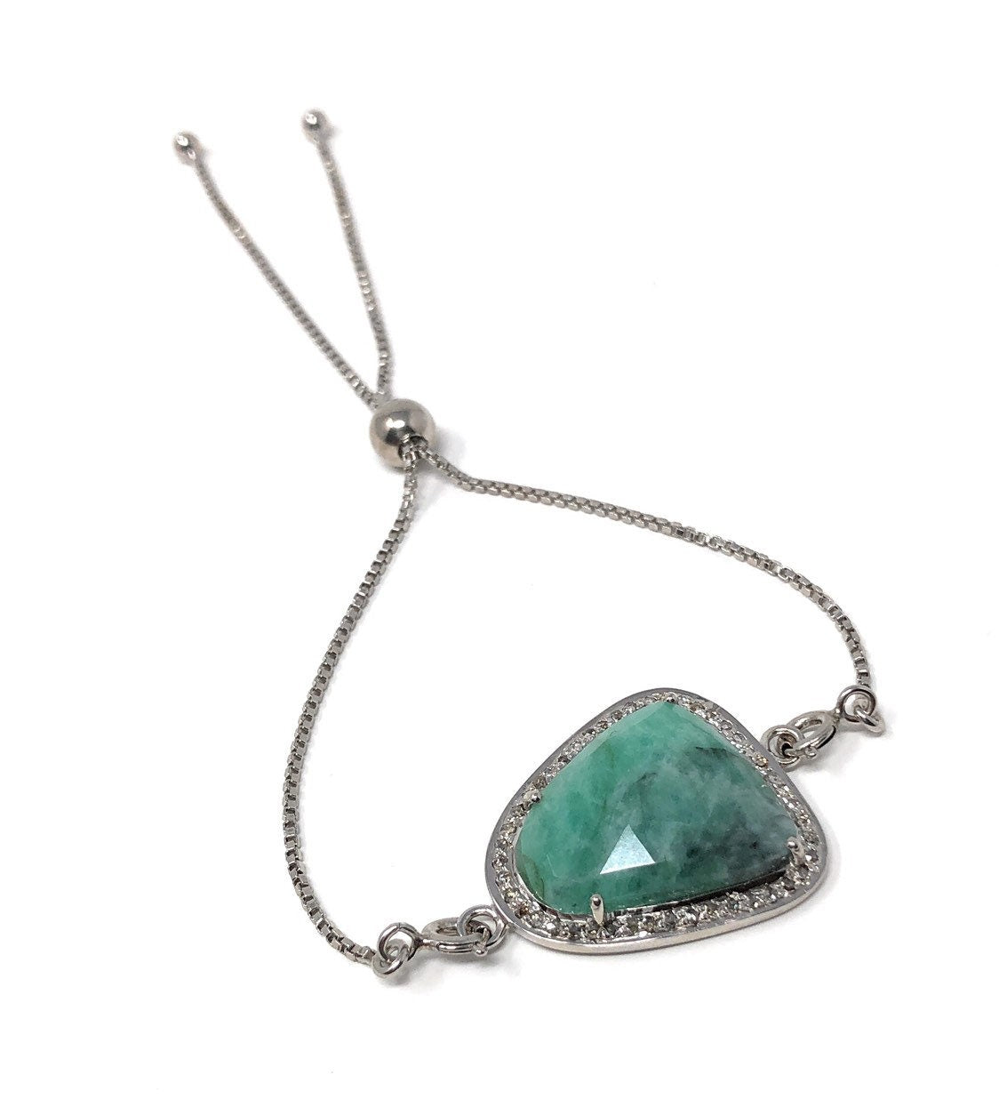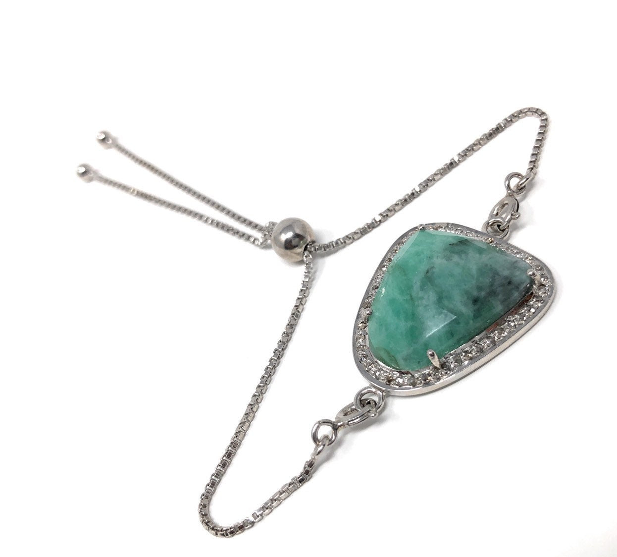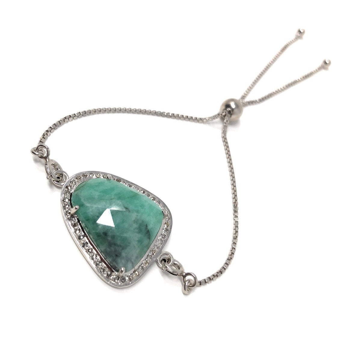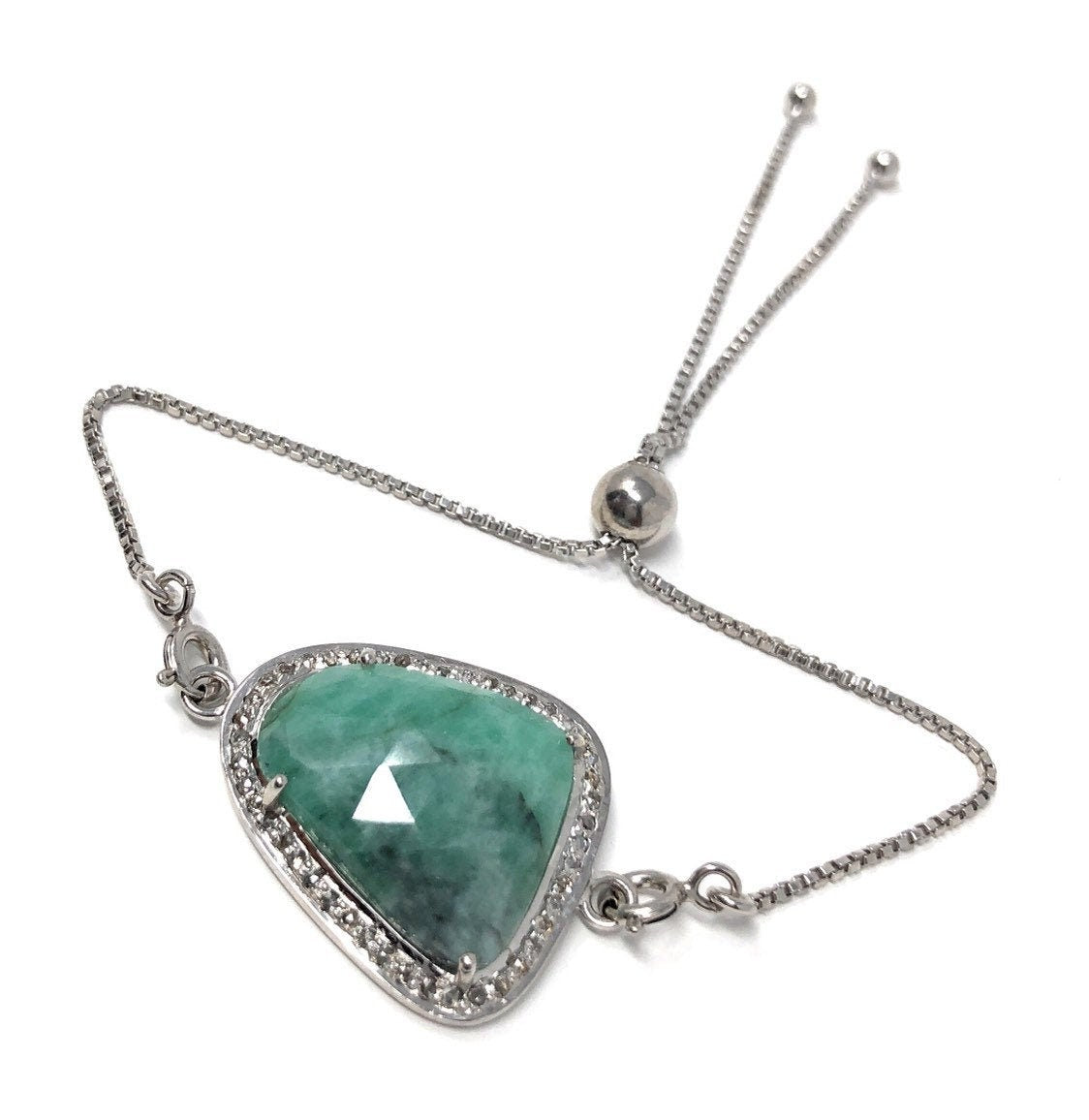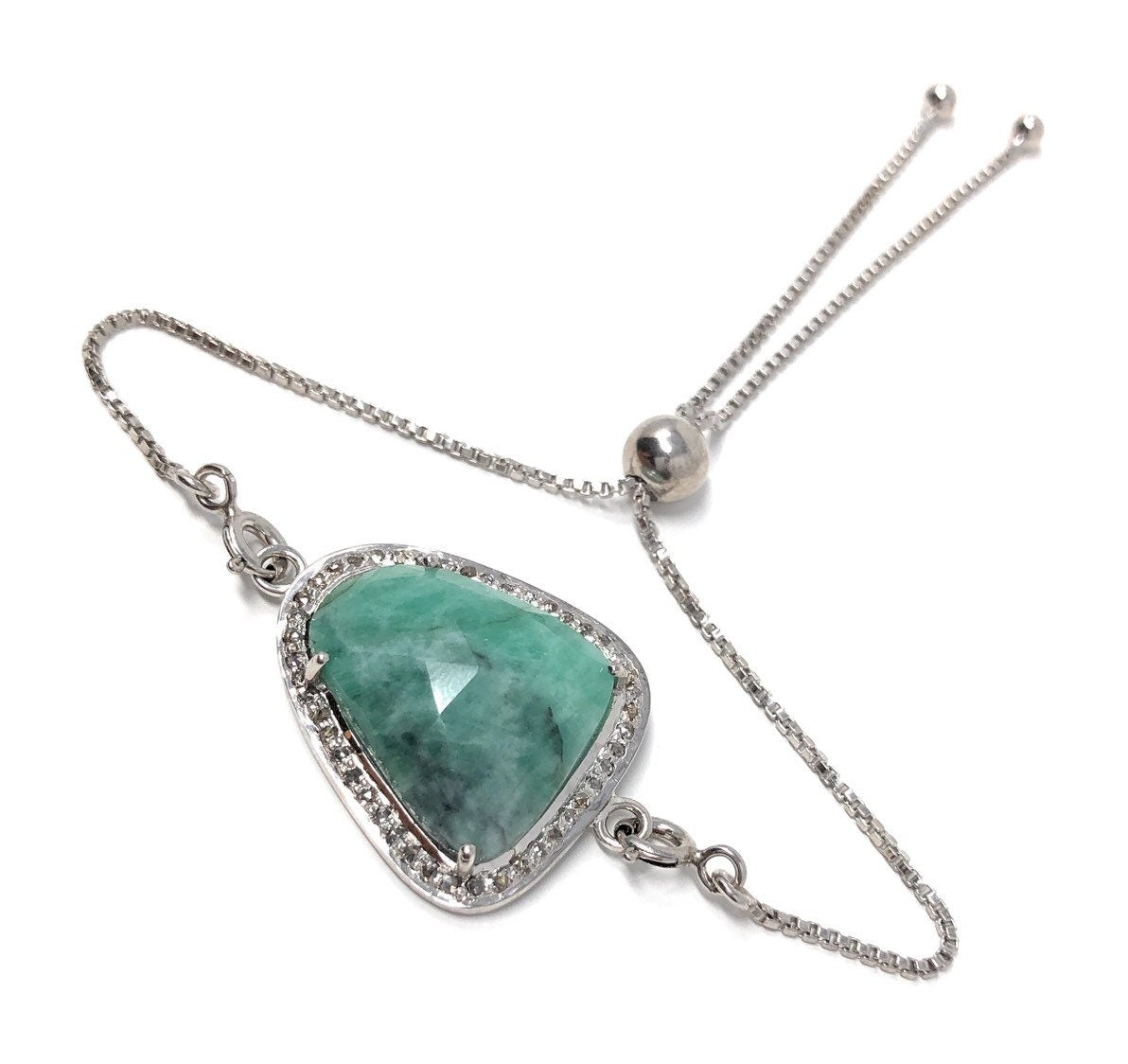Emerald Bracelet, Natural Emerald Pave Diamond Bracelet, Sterling Silver Adjustable Bolo Bracelet, Gemstone Bracelet, Jewelry Gifts for Her