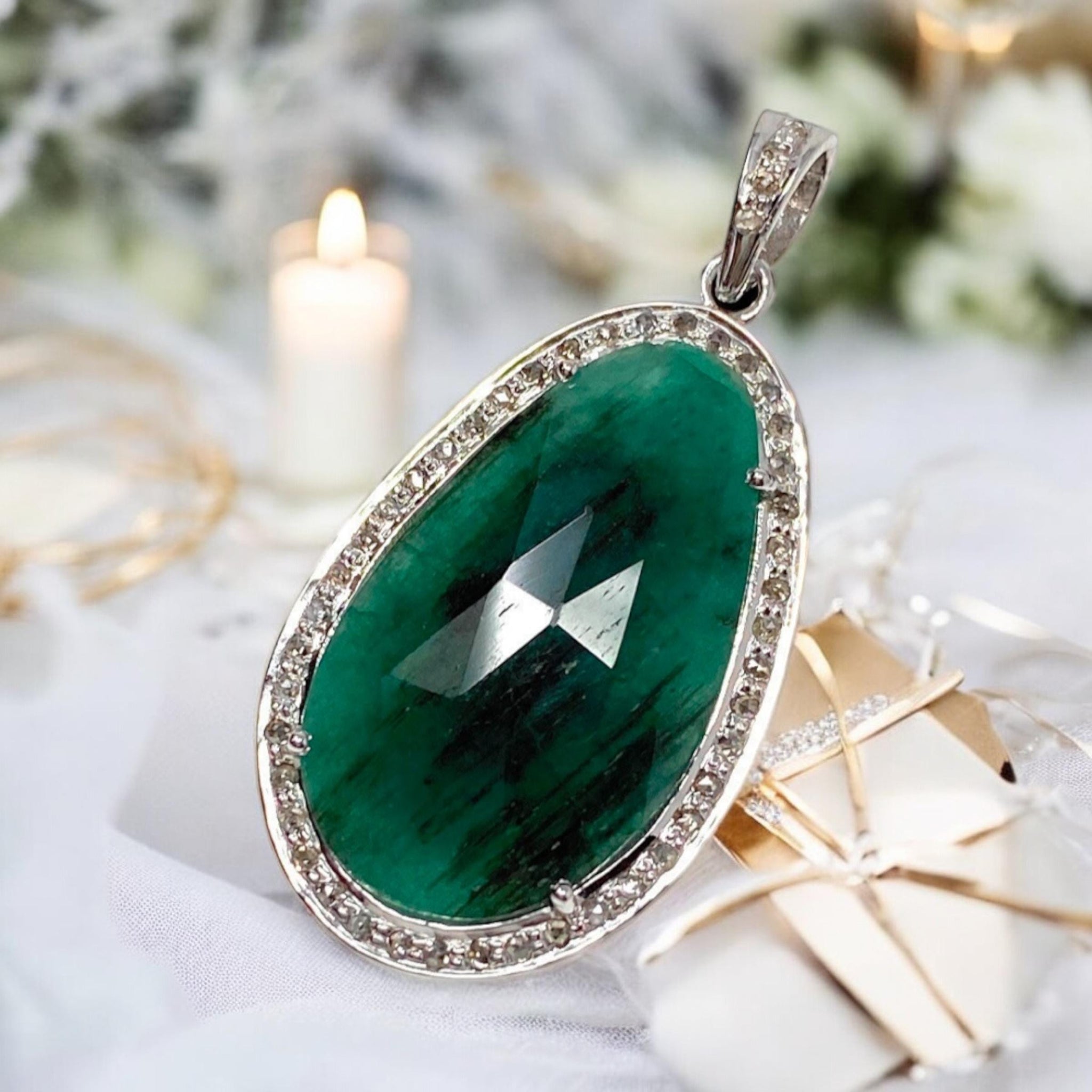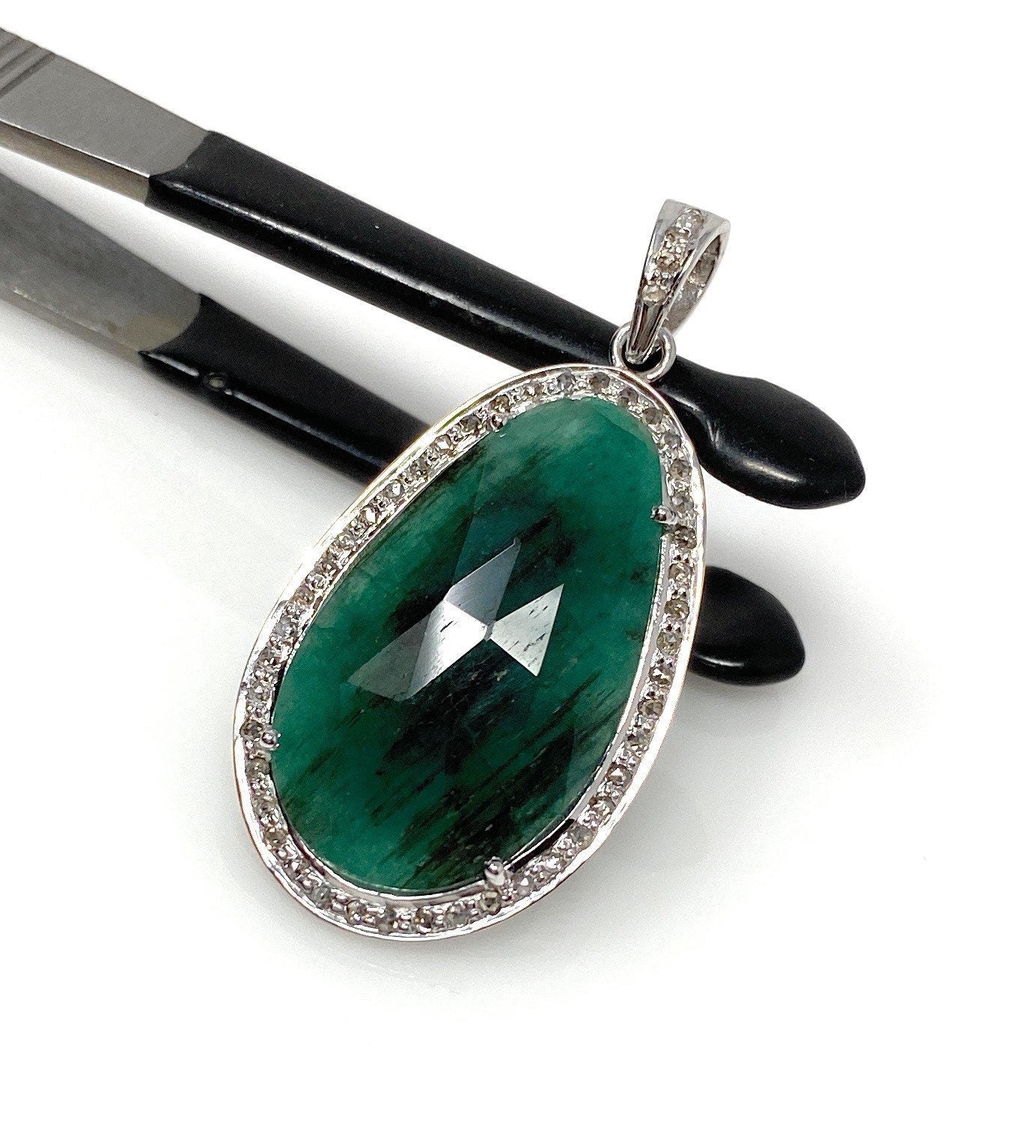 Natural Genuine Rose Cut Sakota Emerald Sterling Silver Diamond Pendant.